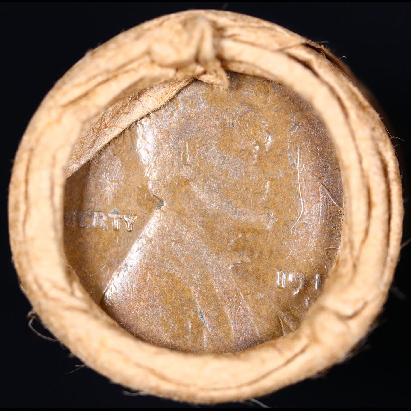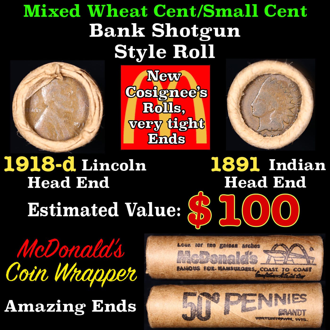Mixed small cents 1c orig shotgun roll, 1918-d Wheat Cent, 1891 Indian Cent other end, McDonalds Wrapper.
