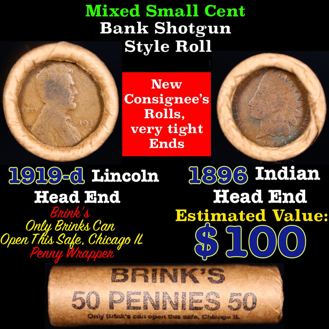 Mixed small cents 1c orig shotgun roll, 1918-d Wheat Cent, 1891 Indian Cent other end, brinks Wrapper. The roll is held in an old Rare & Collectable Brinks 'Only Brinks Can Open This Safe, Chicago IL' Penny wrapper. Actual roll pictured is the roll you will get. A great original bank shotgun roll with very tight ends. We have opened a few of these rolls. They seem to be mixed small cents including Indians, Wheats, Steel cents & some Flying Eagles mixed in. These shotgun rolls are all from a new consignee. They are all frrom one Estate.