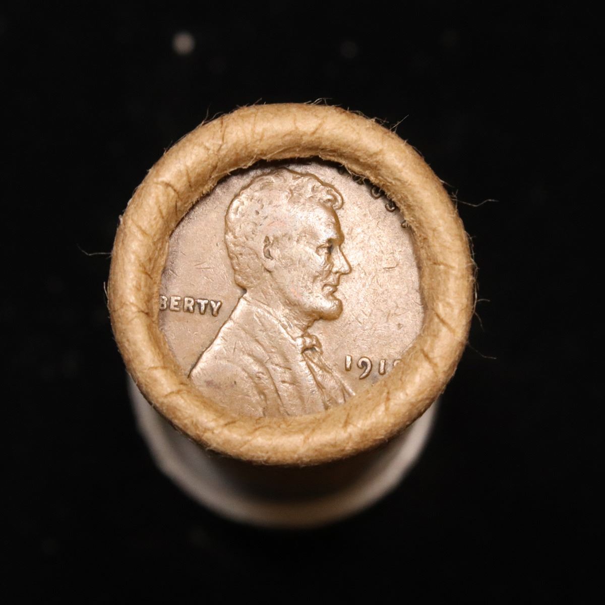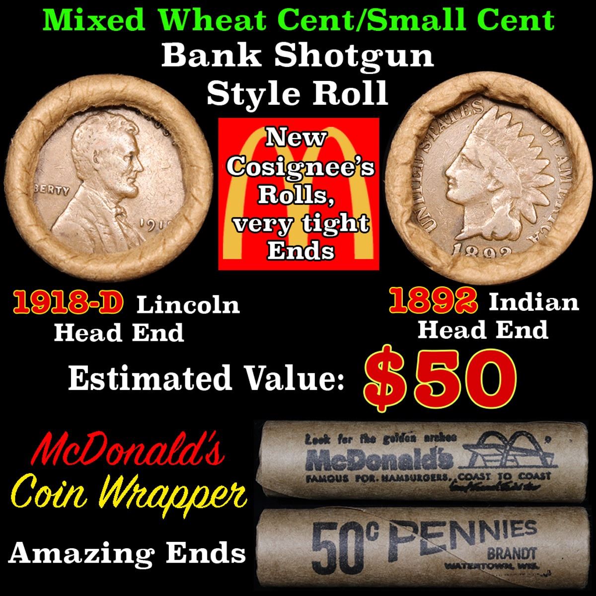 Mixed small cents 1c orig shotgun roll, 1918-d Wheat Cent, 1892 Indian Cent other end. The roll is held in an old Rare & Collectable McDonalds Brandt wrapper. Actual roll pictured is the roll you will get. A great original bank shotgun roll with very tight ends. We have opened a few of these rolls. They seem to be mixed small cents including Indians, Wheats, Steel cents & some Flying Eagles mixed in. These shotgun rolls are all from a new consignee. They are all frrom one Estate.