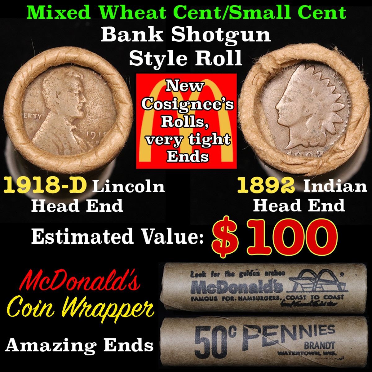 Mixed small cents 1c orig shotgun roll, 1918-d Wheat Cent, 1892 Indian Cent other end. The roll is held in an old Rare & Collectable McDonalds Brandt wrapper. Actual roll pictured is the roll you will get. A great original bank shotgun roll with very tight ends. We have opened a few of these rolls. They seem to be mixed small cents including Indians, Wheats, Steel cents & some Flying Eagles mixed in. These shotgun rolls are all from a new consignee. They are all frrom one Estate.
