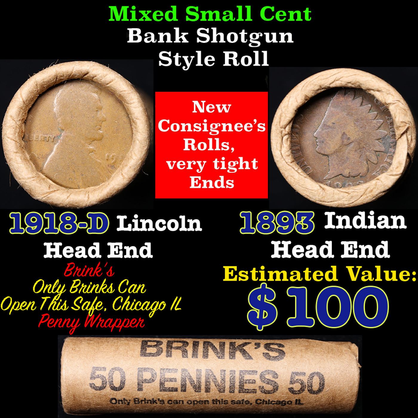 Mixed small cents 1c orig shotgun roll, 1918-d Wheat Cent, 1893 Indian Cent other end, Brinks Wrapper. The roll is held in an old Rare & Collectable Brinks Wrapper. Actual roll pictured is the roll you will get. A great original bank shotgun roll with very tight ends. We have opened a few of these rolls. They seem to be mixed small cents including Indians, Wheats, Steel cents & some Flying Eagles mixed in. These shotgun rolls are all from a new consignee. They are all frrom one Estate.