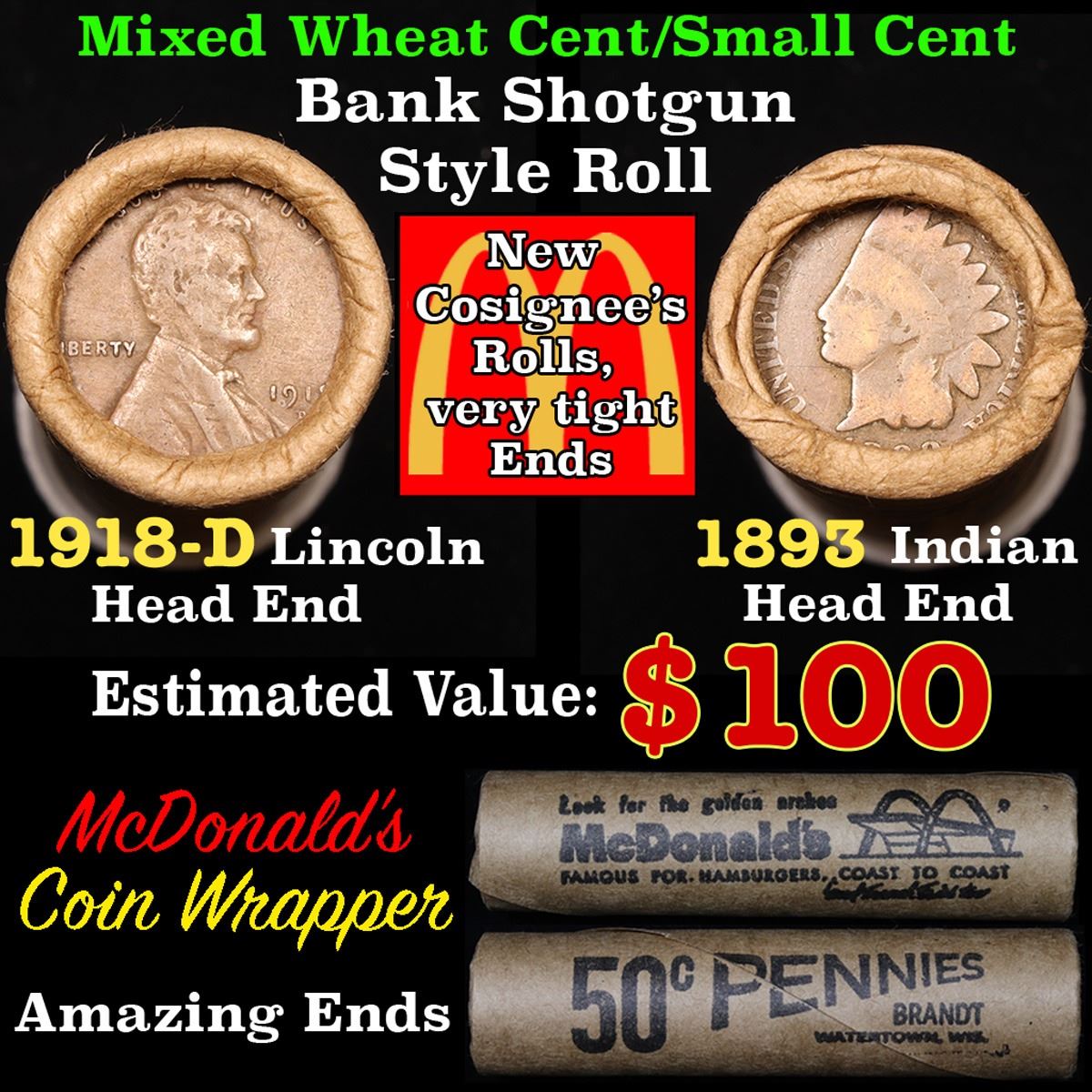 Mixed small cents 1c orig shotgun roll, 1918-d Wheat Cent, 1893 Indian Cent other end,McDnalds Wrapper. The roll is held in an old Rare & Collectable McDonalds Brandt wrapper. Look For The Golden Arches. Actual roll pictured is the roll you will get. A great original bank shotgun roll with very tight ends. We have opened a few of these rolls. They seem to be mixed small cents including Indians, Wheats, Steel cents & some Flying Eagles mixed in. These shotgun rolls are all from a new consignee. They are all frrom one Estate.