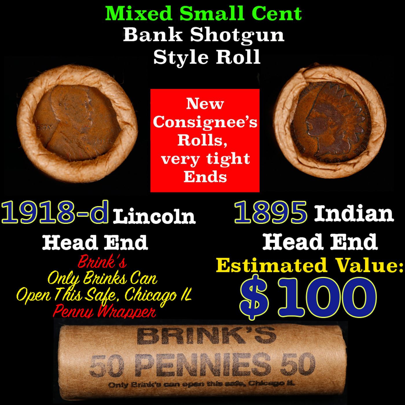 Mixed small cents 1c orig shotgun roll, 1918-d Wheat Cent, 1895 Indian Cent other end, Brinks Wrapper.. The roll is held in an old Rare & Collectable Brinks 'Only Brinks Can Open This Safe, Chicago IL' Penny wrapper. Actual roll pictured is the roll you will get. A great original bank shotgun roll with very tight ends. We have opened a few of these rolls. They seem to be mixed small cents including Indians, Wheats, Steel cents & some Flying Eagles mixed in. These shotgun rolls are all from a new consignee. They are all frrom one Estate.