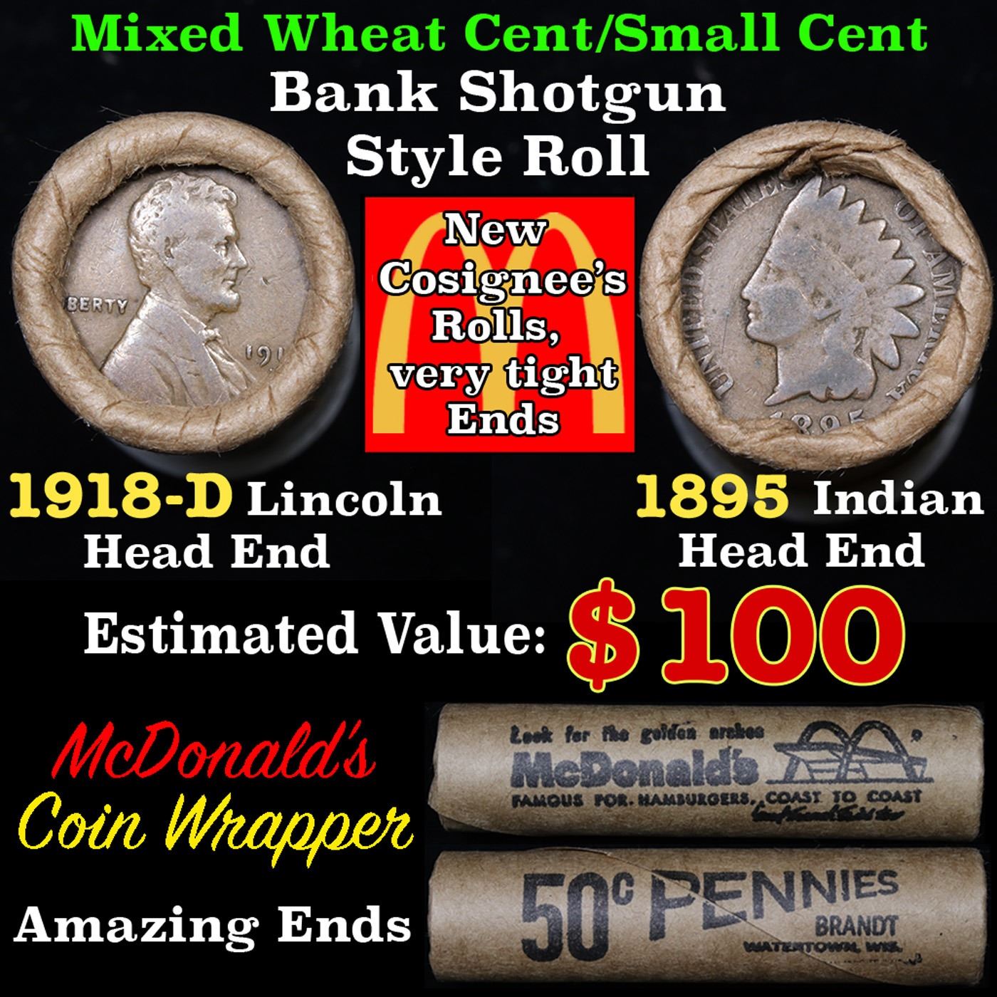Mixed small cents 1c orig shotgun roll, 1918-d Wheat Cent, 1895 Indian Cent other end, McDnalds Wrapper. The roll is held in an old Rare & Collectable McDnalds Wrapper. Look For The Golden Arches. Actual roll pictured is the roll you will get. A great original bank shotgun roll with very tight ends. We have opened a few of these rolls. They seem to be mixed small cents including Indians, Wheats, Steel cents & some Flying Eagles mixed in. These shotgun rolls are all from a new consignee. They are all frrom one Estate.