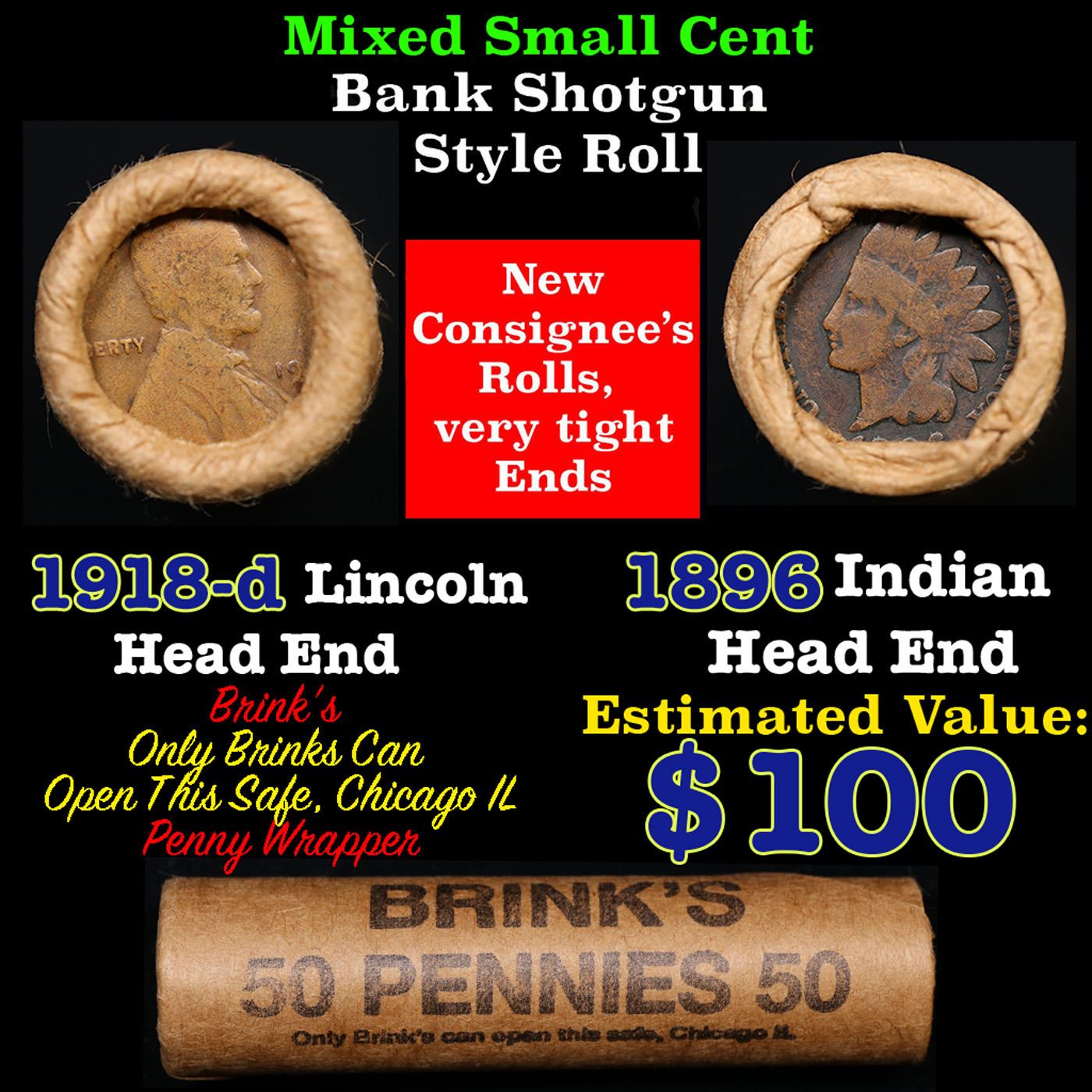 Mixed small cents 1c orig shotgun roll, 1918-d Wheat Cent, 1896 Indian Cent other end, Brinks Wrapper.. The roll is held in an old Rare & Collectable Brinks 'Only Brinks Can Open This Safe, Chicago IL' Penny wrapper. Actual roll pictured is the roll you will get. A great original bank shotgun roll with very tight ends. We have opened a few of these rolls. They seem to be mixed small cents including Indians, Wheats, Steel cents & some Flying Eagles mixed in. These shotgun rolls are all from a new consignee. They are all frrom one Estate.