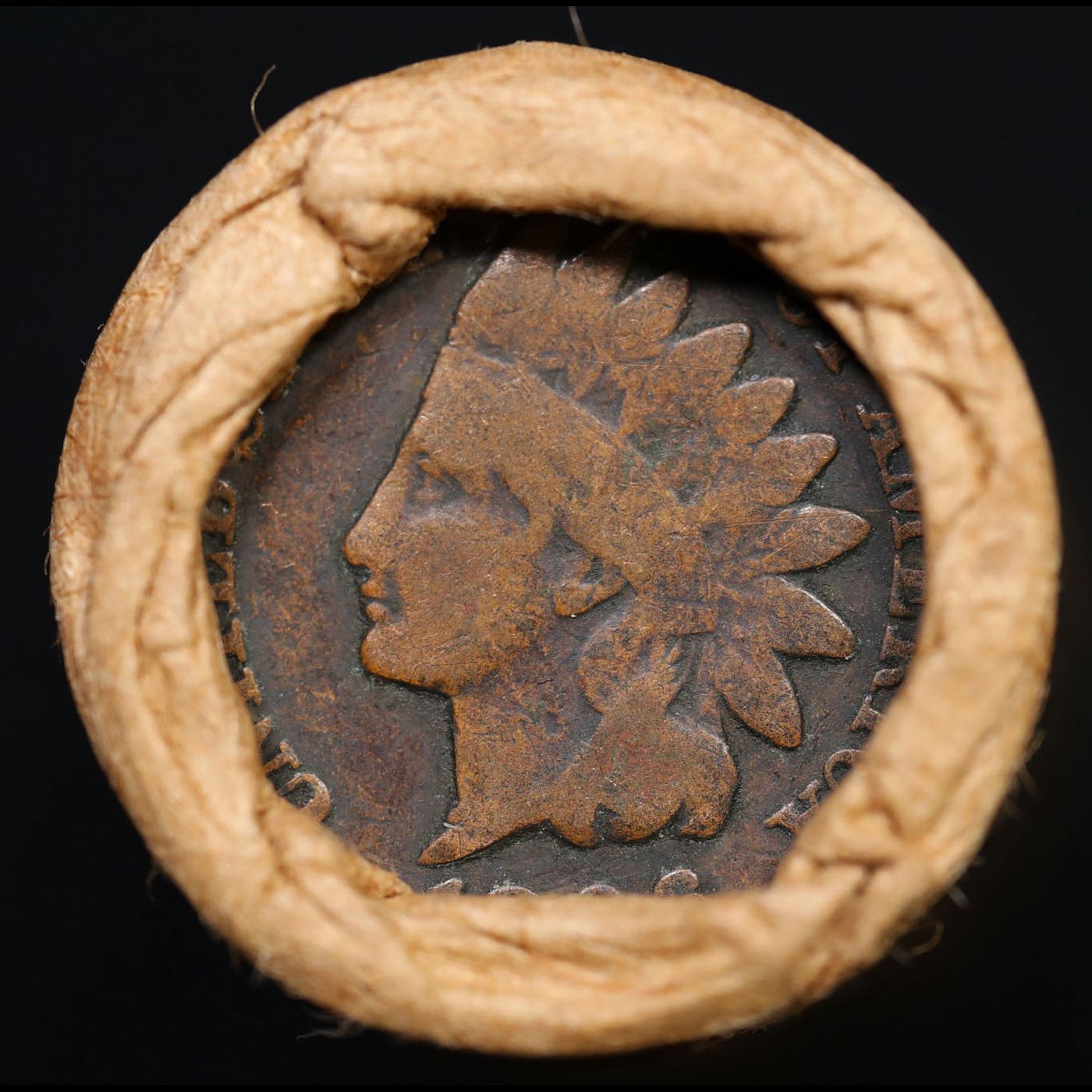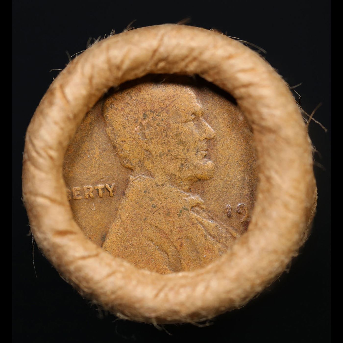 Mixed small cents 1c orig shotgun roll, 1918-d Wheat Cent, 1896 Indian Cent other end, Brinks Wrappe