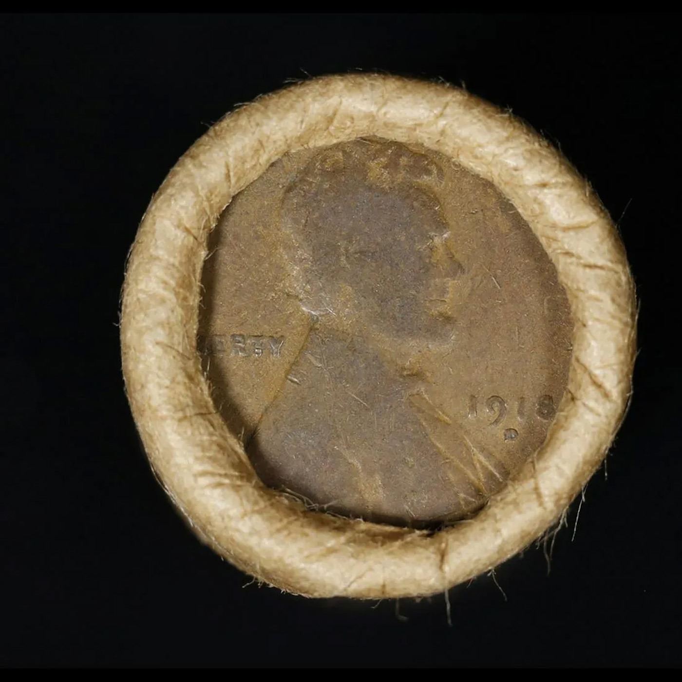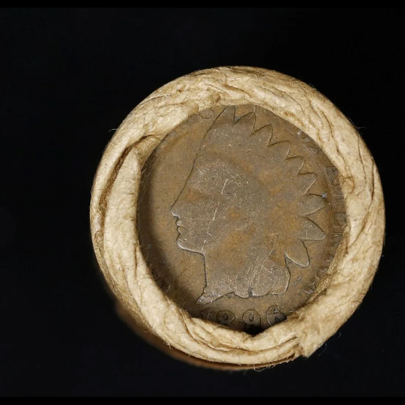 Mixed small cents 1c orig shotgun roll, 1918-d Wheat Cent, 1896 Indian Cent other end, Brinks Wrappe