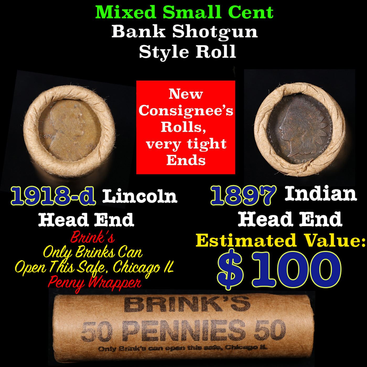 Mixed small cents 1c orig shotgun roll, 1918-d Wheat Cent, 1897 Indian Cent other end, Brinks Wrapper Grades. The roll is held in an old Rare & Collectable Brinks Wrapper. Actual roll pictured is the roll you will get. A great original bank shotgun roll with very tight ends. We have opened a few of these rolls. They seem to be mixed small cents including Indians, Wheats, Steel cents & some Flying Eagles mixed in. These shotgun rolls are all from a new consignee. They are all frrom one Estate.