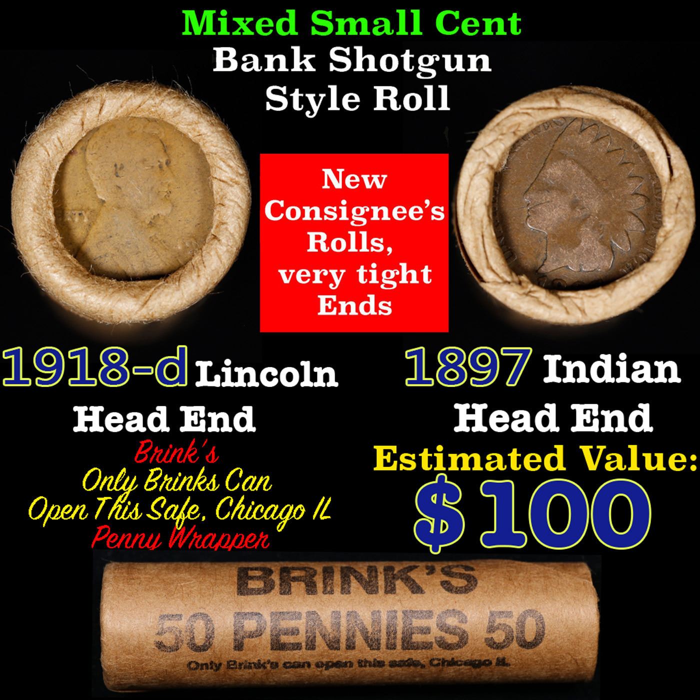 Mixed small cents 1c orig shotgun roll, 1918-d Wheat Cent, 1897 Indian Cent other end, Brinks Wrapper.. The roll is held in an old Rare & Collectable Brinks 'Only Brinks Can Open This Safe, Chicago IL' Penny wrapper. Actual roll pictured is the roll you will get. A great original bank shotgun roll with very tight ends. We have opened a few of these rolls. They seem to be mixed small cents including Indians, Wheats, Steel cents & some Flying Eagles mixed in. These shotgun rolls are all from a new consignee. They are all frrom one Estate.