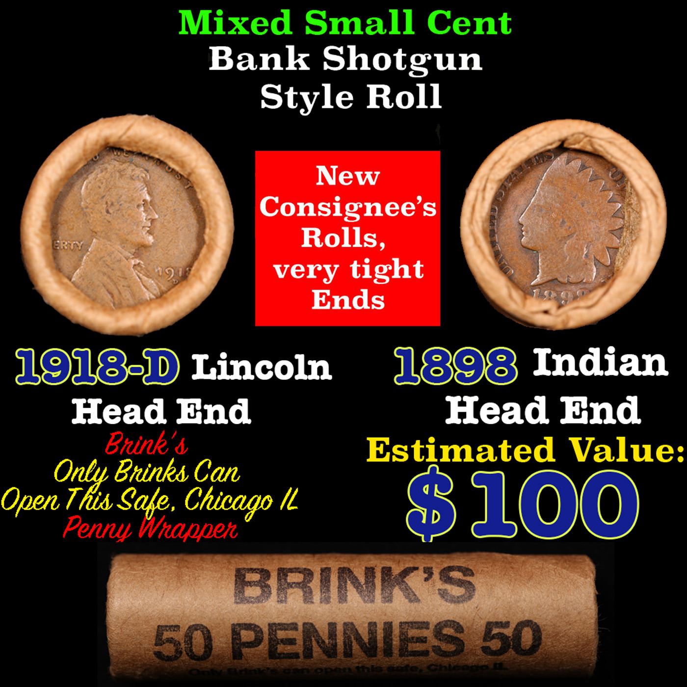 Mixed small cents 1c orig shotgun roll, 1918-d Wheat Cent, 1898 Indian Cent other end, Brinks Wrapper. The roll is held in an old Rare & Collectable Brinks Wrapper. Actual roll pictured is the roll you will get. A great original bank shotgun roll with very tight ends. We have opened a few of these rolls. They seem to be mixed small cents including Indians, Wheats, Steel cents & some Flying Eagles mixed in. These shotgun rolls are all from a new consignee. They are all frrom one Estate.