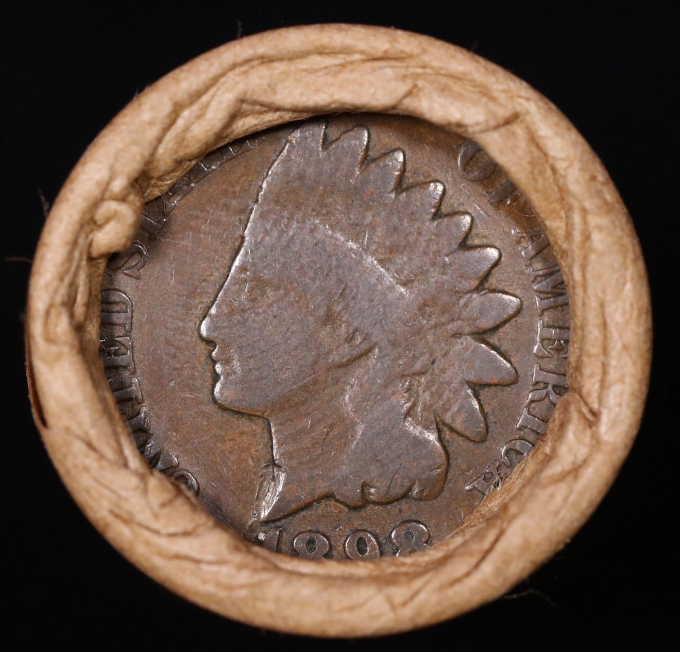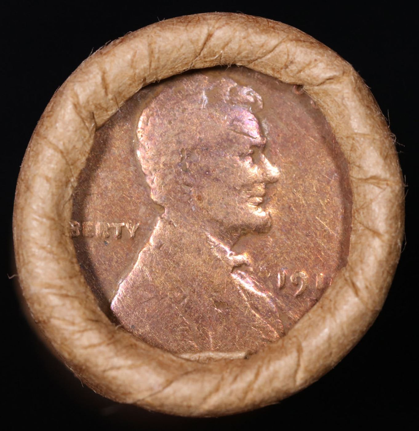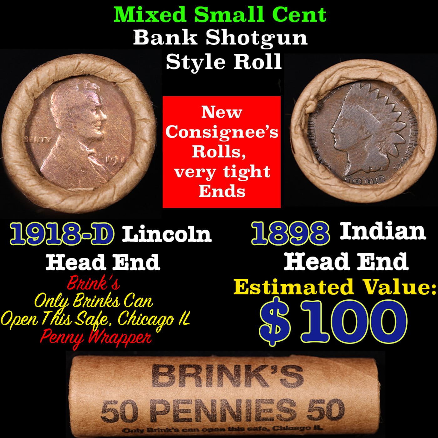 Mixed small cents 1c orig shotgun roll, 1918-d Wheat Cent, 1898 Indian Cent other end, brinks Wrappe
