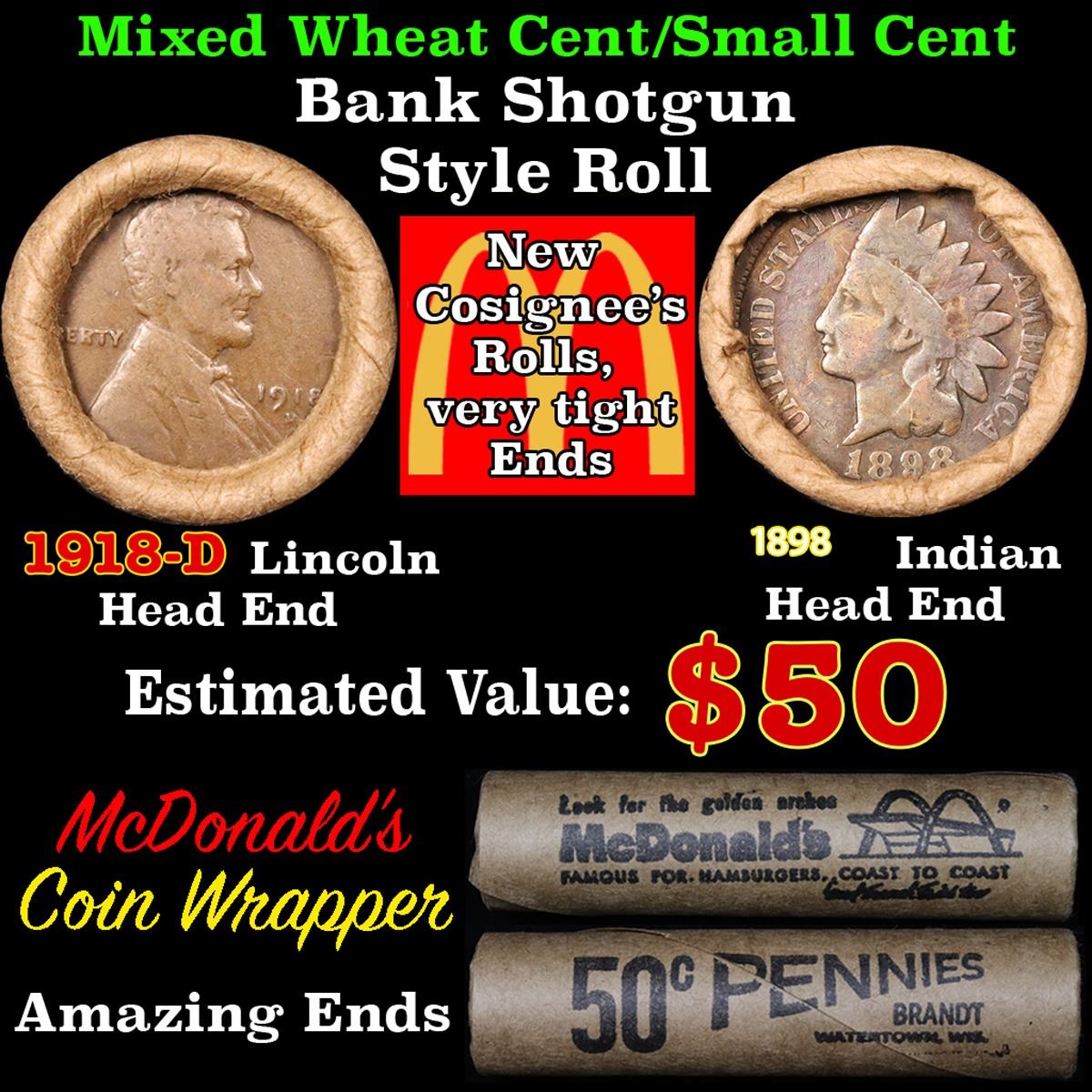 Mixed small cents 1c orig shotgun roll, 1918-d Wheat Cent, 1898 Indian Cent other end . .. The roll is held in an old Rare & Collectable McDonalds Brandt wrapper. Actual roll pictured is the roll you will get. A great original bank shotgun roll with very tight ends. We have opened a few of these rolls. They seem to be mixed small cents including Indians, Wheats, Steel cents & some Flying Eagles mixed in. These shotgun rolls are all from a new consignee. They are all frrom one Estate.