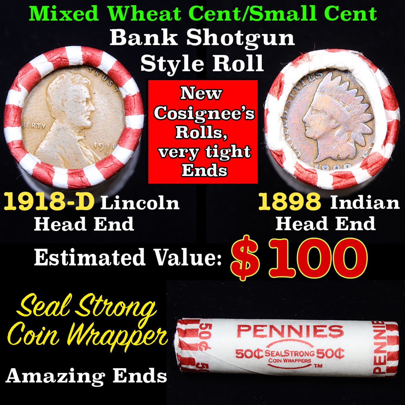 Mixed small cents 1c orig shotgun roll, 1918-d Wheat Cent, 1898 Indian cent other end, Seal Strong Wrapper.        The roll is held in an old Rare & Collectable Seal Strong Wrapper. Actual roll pictured is the roll you will get. A great original bank shotgun roll with very tight ends. We have opened a few of these rolls. They seem to be mixed small cents including Indians, Wheats, Steel cents & some Flying Eagles mixed in. These shotgun rolls are all from a new consignee. They are all frrom one Estate.