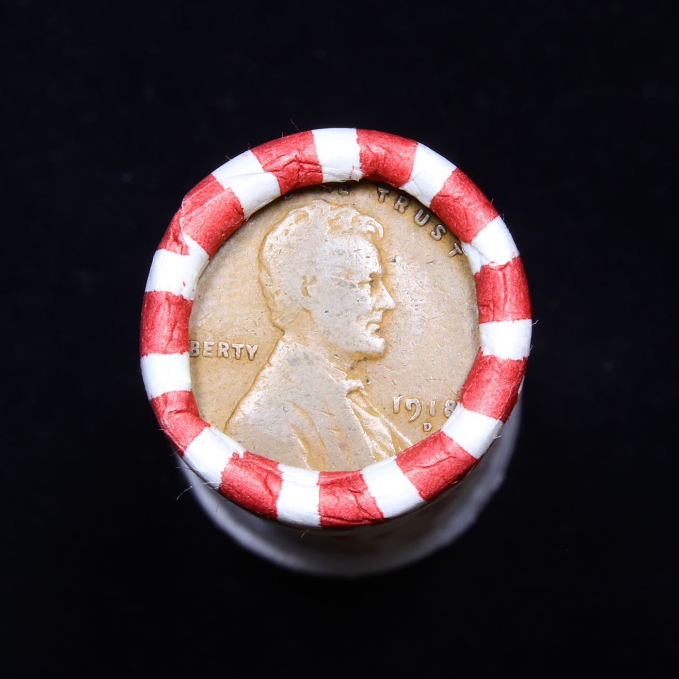 Mixed small cents 1c orig shotgun roll, 1918-d Wheat Cent, 1898 Indian cent other end, Seal Strong W