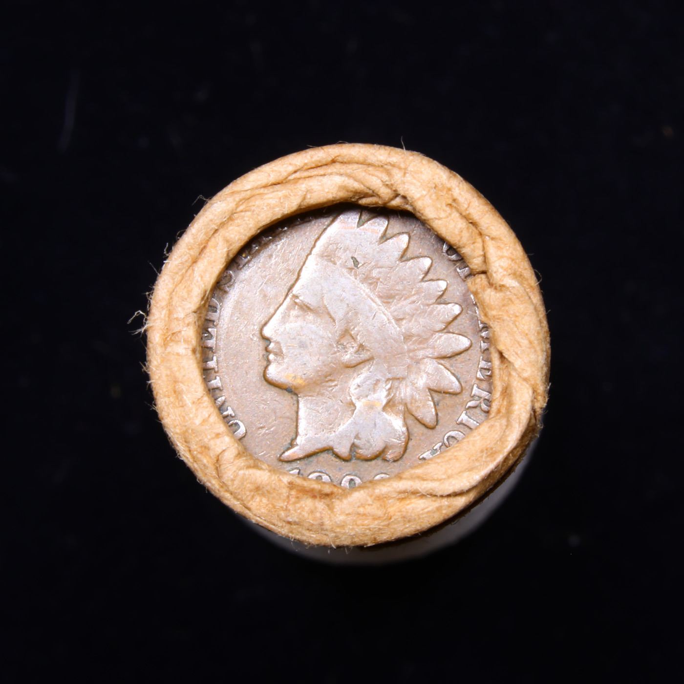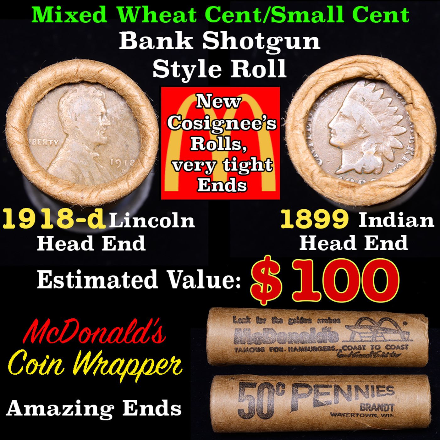 Mixed small cents 1c orig shotgun roll, 1918-d Wheat Cent, 1899 Indian Cent other end, McDonalds Wra