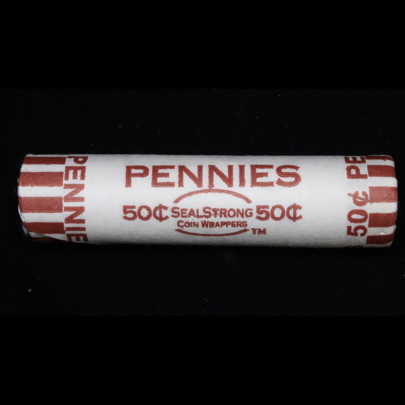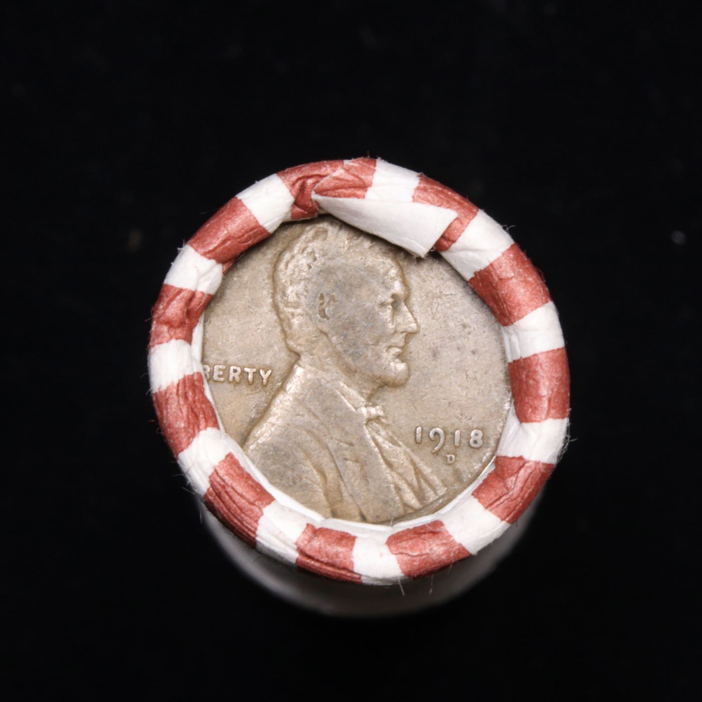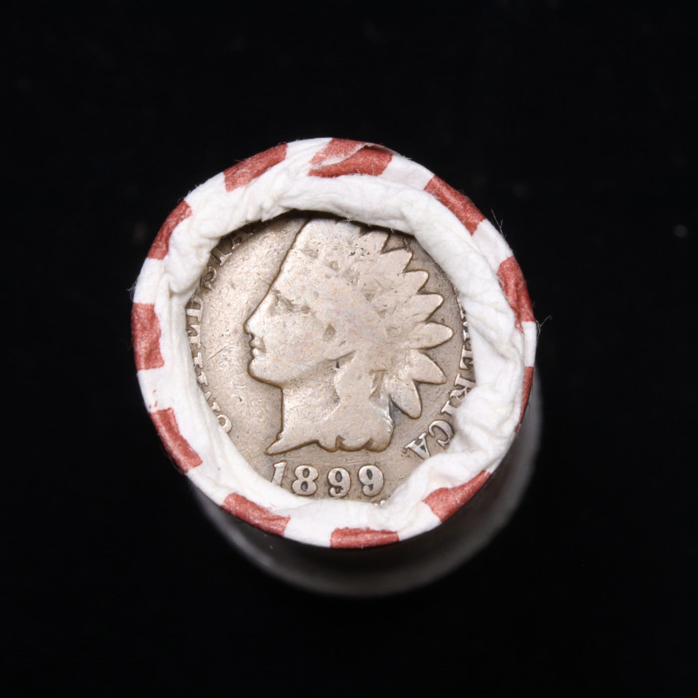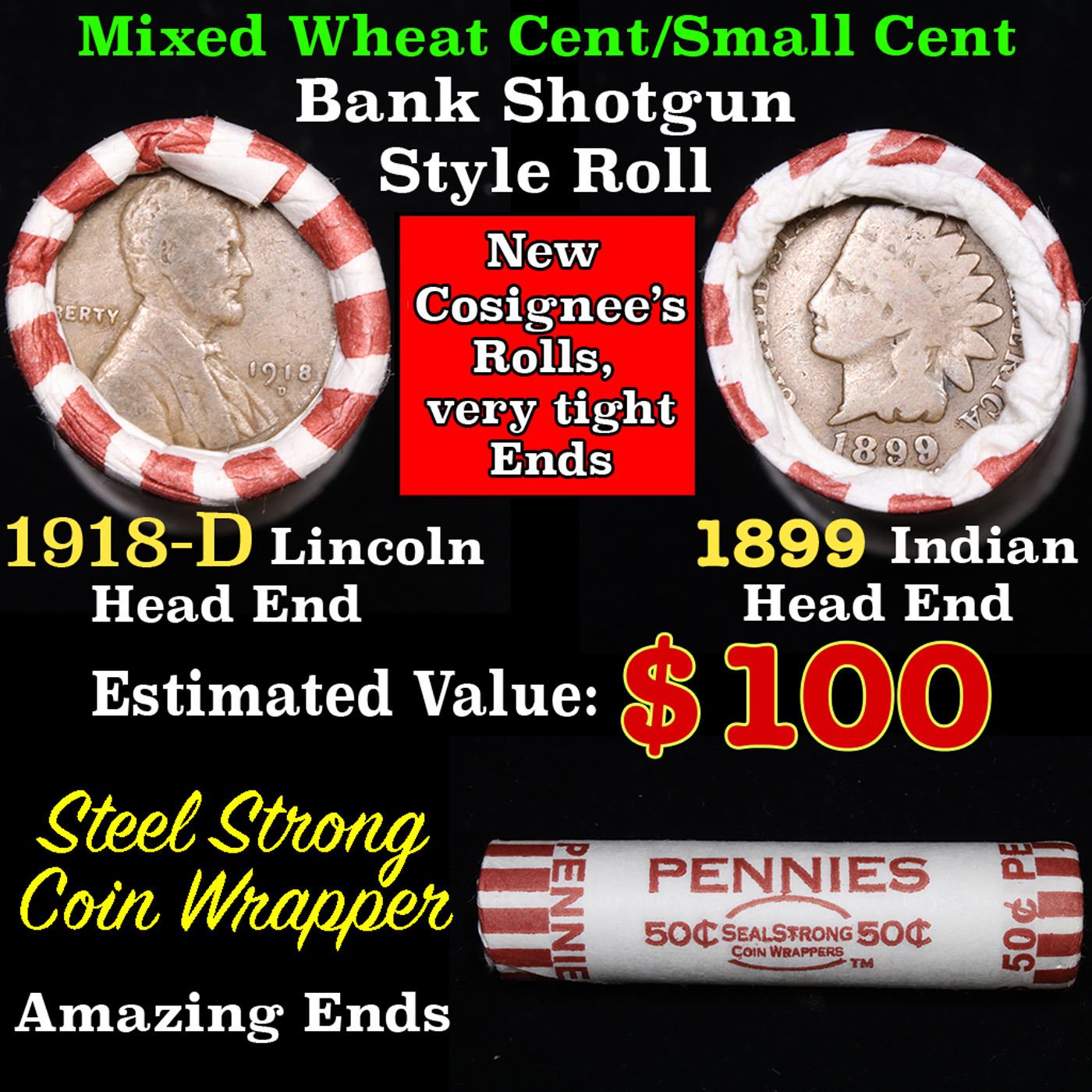 Mixed small cents 1c orig shotgun roll, 1918-d Wheat Cent, 1899 Indian Cent other end, Seal Strong W