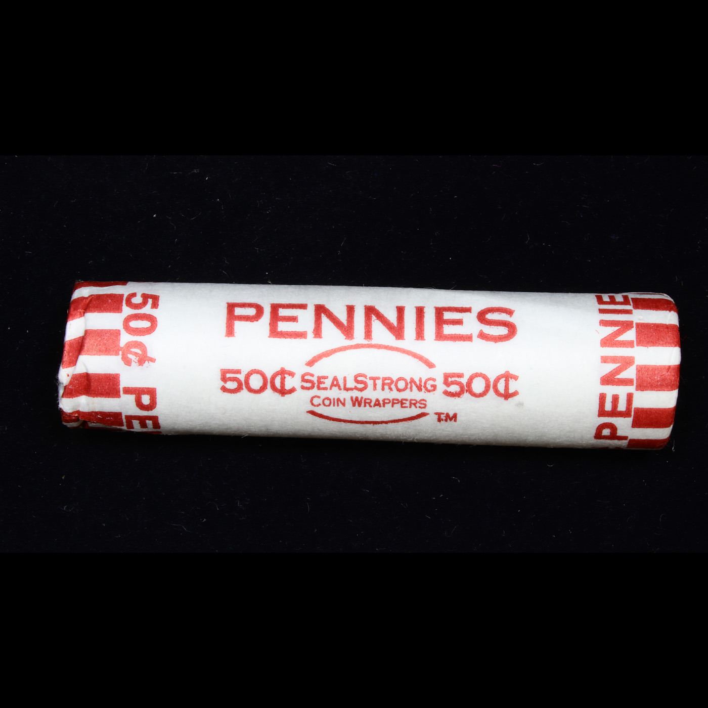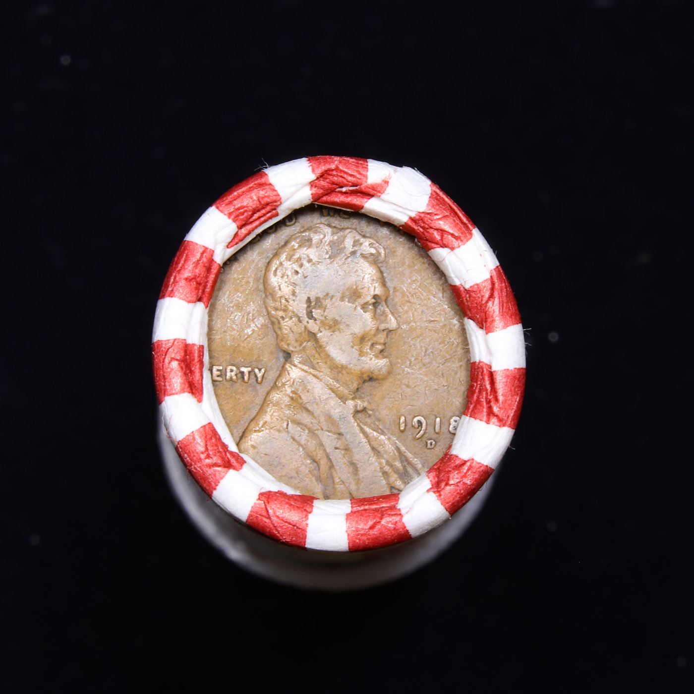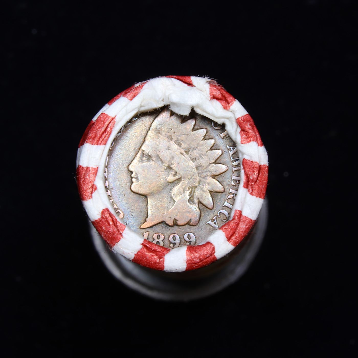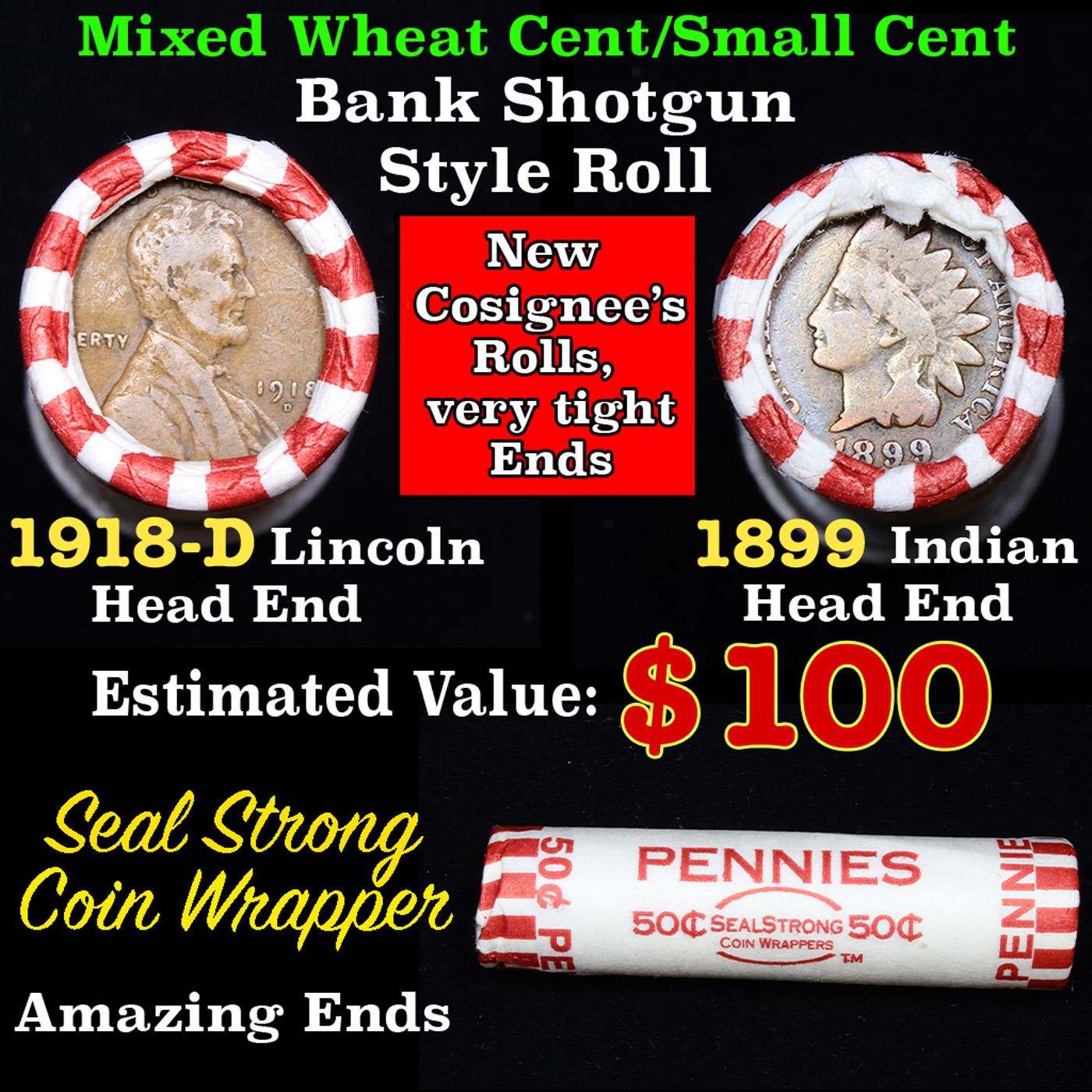 Mixed small cents 1c orig shotgun roll, 1918-d Wheat Cent, 1899 Indian Cent other end, Seal Strong W