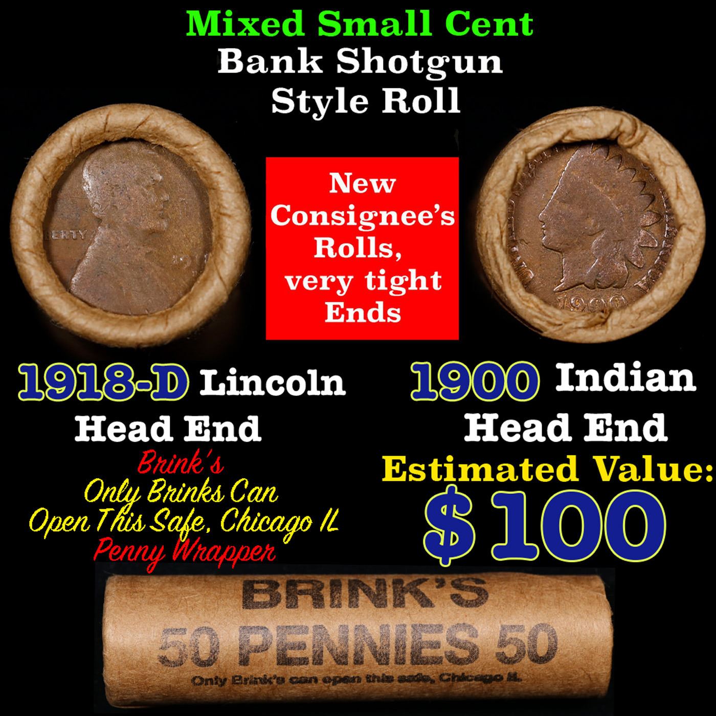 Mixed small cents 1c orig shotgun roll, 1918-d Wheat Cent, 1900 Indian Cent other end, Brinks Wrapper. The roll is held in an old Rare & Collectable Brinks Wrapper. Actual roll pictured is the roll you will get. A great original bank shotgun roll with very tight ends. We have opened a few of these rolls. They seem to be mixed small cents including Indians, Wheats, Steel cents & some Flying Eagles mixed in. These shotgun rolls are all from a new consignee. They are all frrom one Estate.