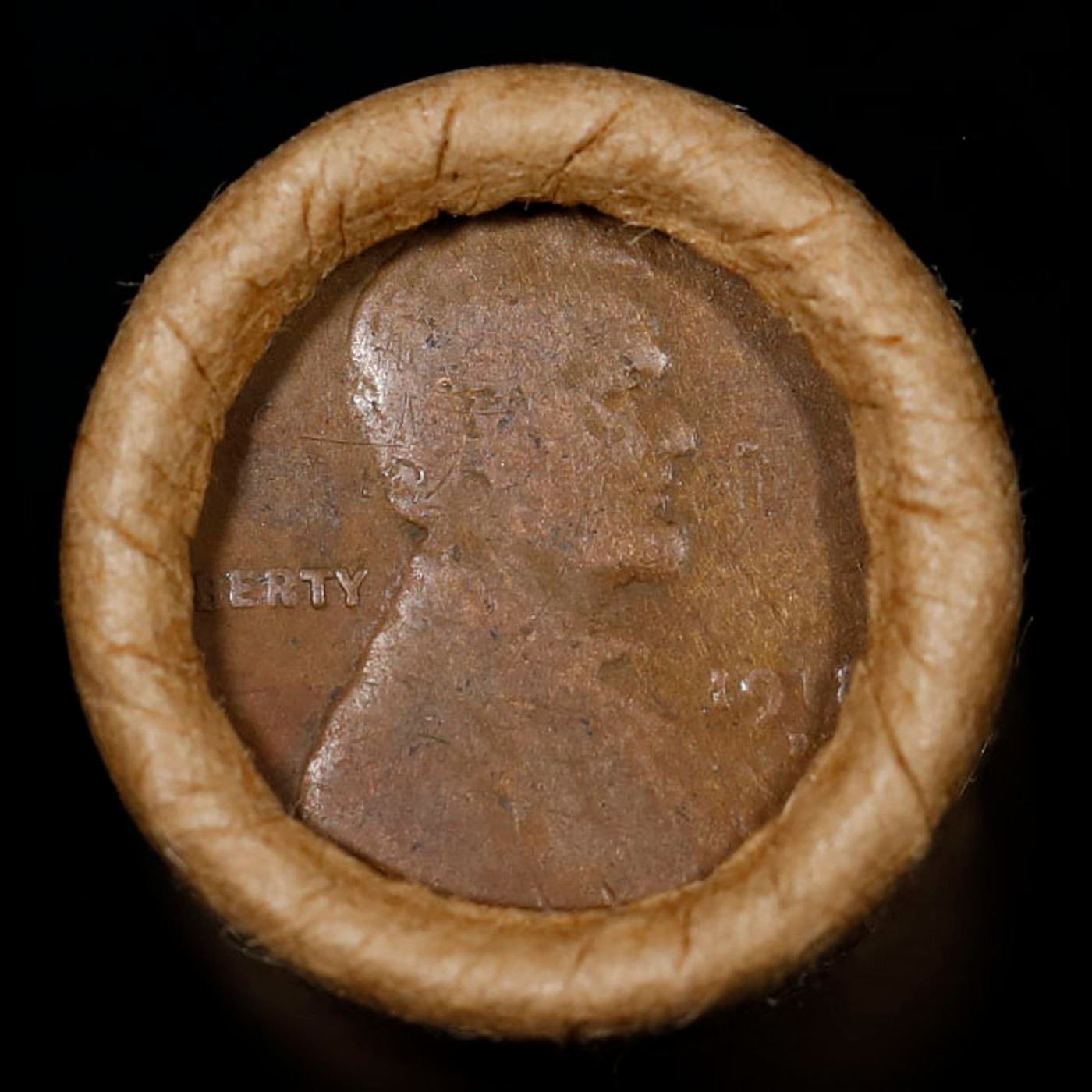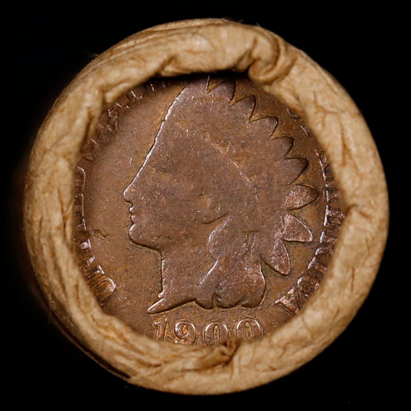 Mixed small cents 1c orig shotgun roll, 1918-d Wheat Cent, 1900 Indian Cent other end, Brinks Wrappe