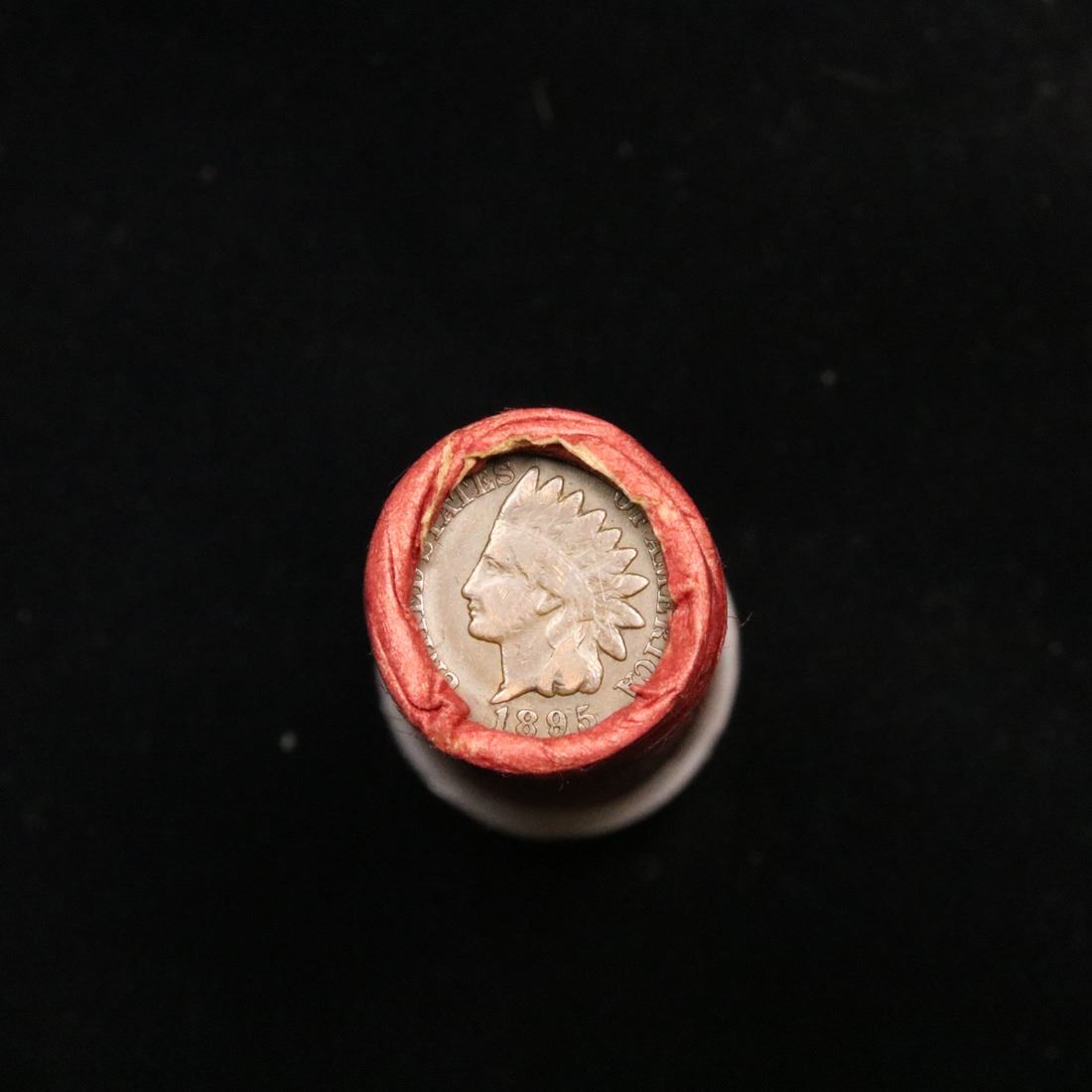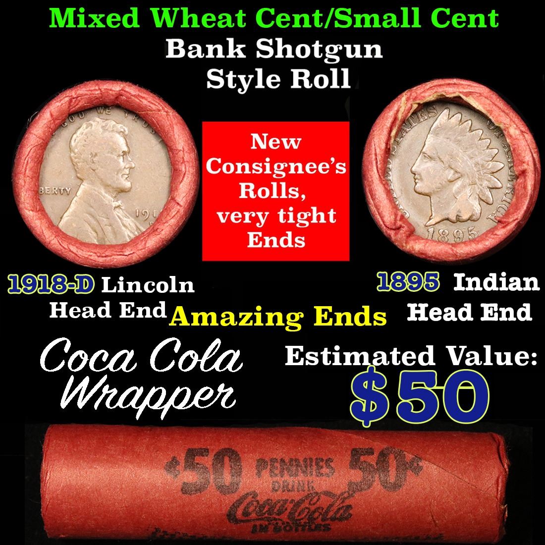 Mixed small cents 1c orig shotgun roll, 1918-d one end, 1895 Indian cent other end. The roll is held in an old, rare and collectible Coca-Cola wrapper. Actual roll pictured is the roll you will get. A great original bank shotgun roll with very tight ends. We have been getting excellent feedback on these rolls. Were being told that close to half the roll are teens, some with mintmarks, there are a few Indians in all the rolls, most of the rolls have steel cents. They seem to be PQ Wheaties rolls. These shotgun rolls are all from a new consignee. They are all frrom one Estate.