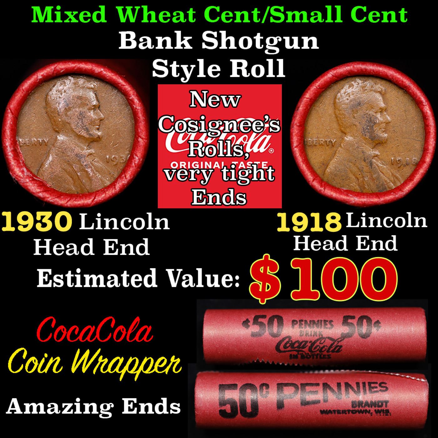Mixed small cents 1c orig shotgun roll, 1918-p Lincoln Cent, 1930-p Lincoln Cent other end, Coca-Cola Brandt Wrapper.. The roll is held in an old Rare & Collectable Brinks 'Only Brinks Can Open This Safe, Chicago IL' Penny wrapper. Actual roll pictured is the roll you will get. A great original bank shotgun roll with very tight ends. We have opened a few of these rolls. They seem to be mixed small cents including Indians, Wheats, Steel cents & some Flying Eagles mixed in. These shotgun rolls are all from a new consignee. They are all frrom one Estate.