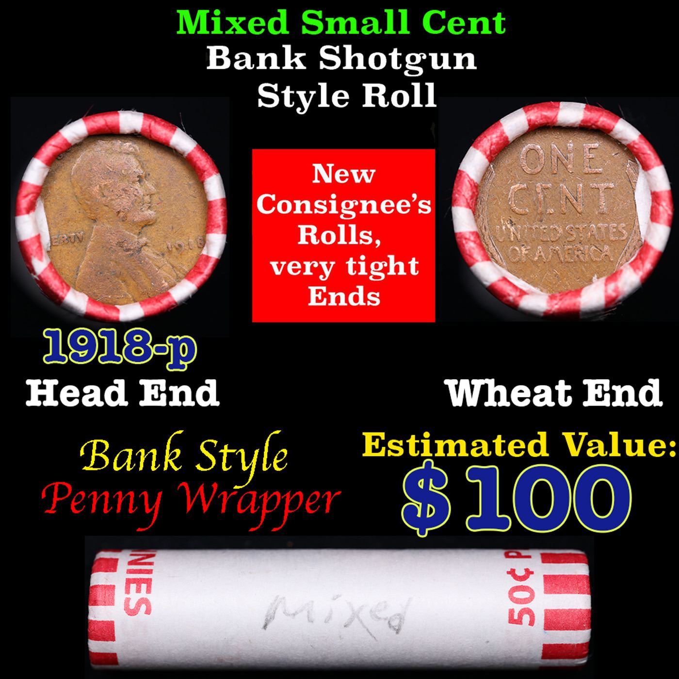 Mixed small cents 1c orig shotgun roll, 1918-p Lincoln Cent, Wheat Cent other end, Bank Wrapper.. Actual roll pictured is the roll you will get. A great original bank shotgun roll with very tight ends. We have opened a few of these rolls. They seem to be mixed small cents including Indians, Wheats, Steel cents & some Flying Eagles mixed in. These shotgun rolls are all from a new consignee. They are all frrom one Estate.