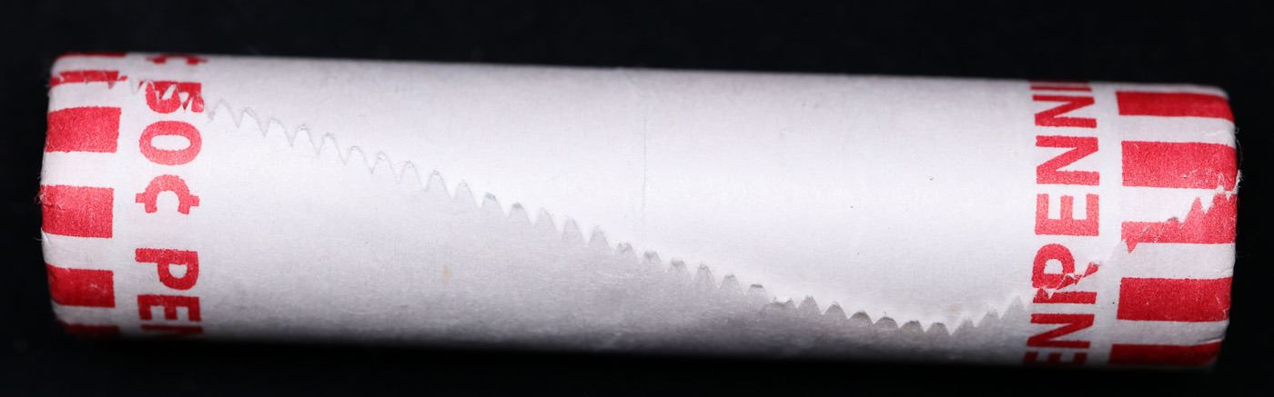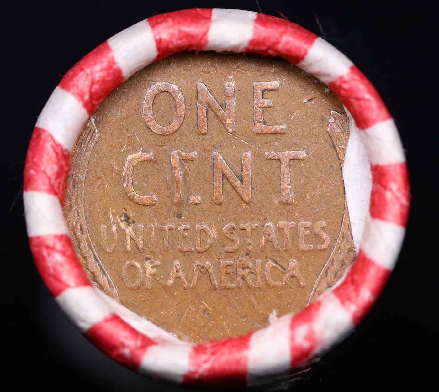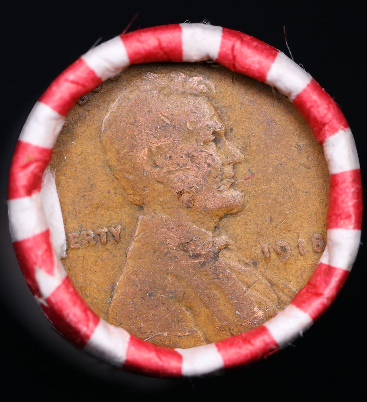 Mixed small cents 1c orig shotgun roll, 1918-p Lincoln Cent, Wheat Cent other end, Bank Wrapper.