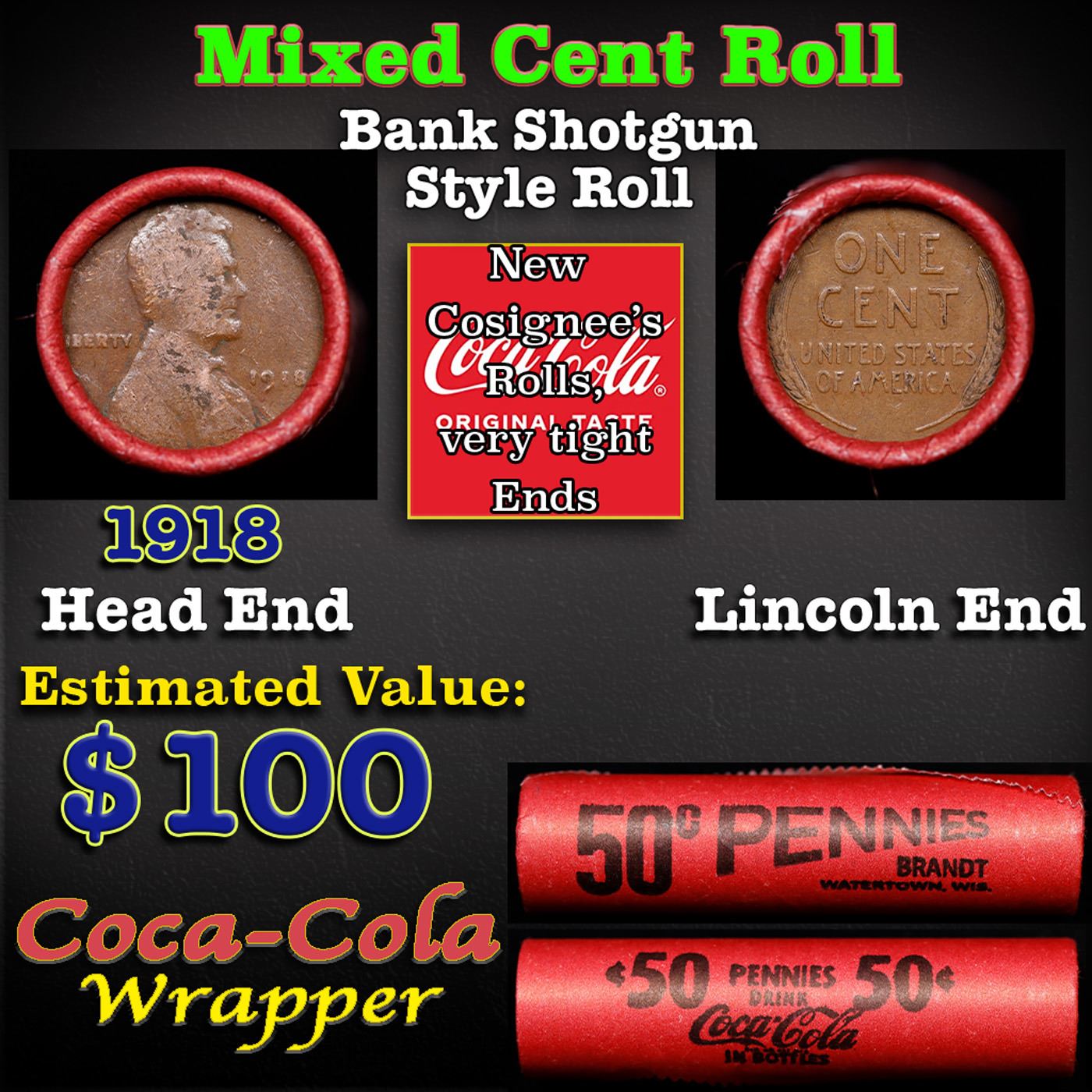 Mixed small cents 1c orig shotgun roll, 1918-p Lincoln Cent, Wheat Cent other end, Coca-Cola Brandt Wrapper..        The roll is held in an old Rare & Collectable Brinks 'Only Brinks Can Open This Safe, Chicago IL' Penny  wrapper. Actual roll pictured is the roll you will get. A great original bank shotgun roll with very tight ends. We have opened a few of these rolls. They seem to be mixed small cents including Indians, Wheats, Steel cents & some Flying Eagles mixed in. These shotgun rolls are all from a new consignee. They are all frrom one Estate.
