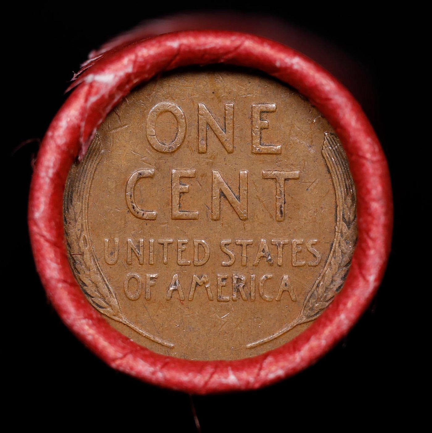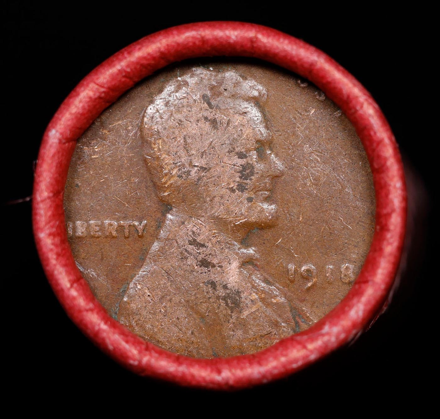 Mixed small cents 1c orig shotgun roll, 1918-p Lincoln Cent, Wheat Cent other end, Coca-Cola Brandt