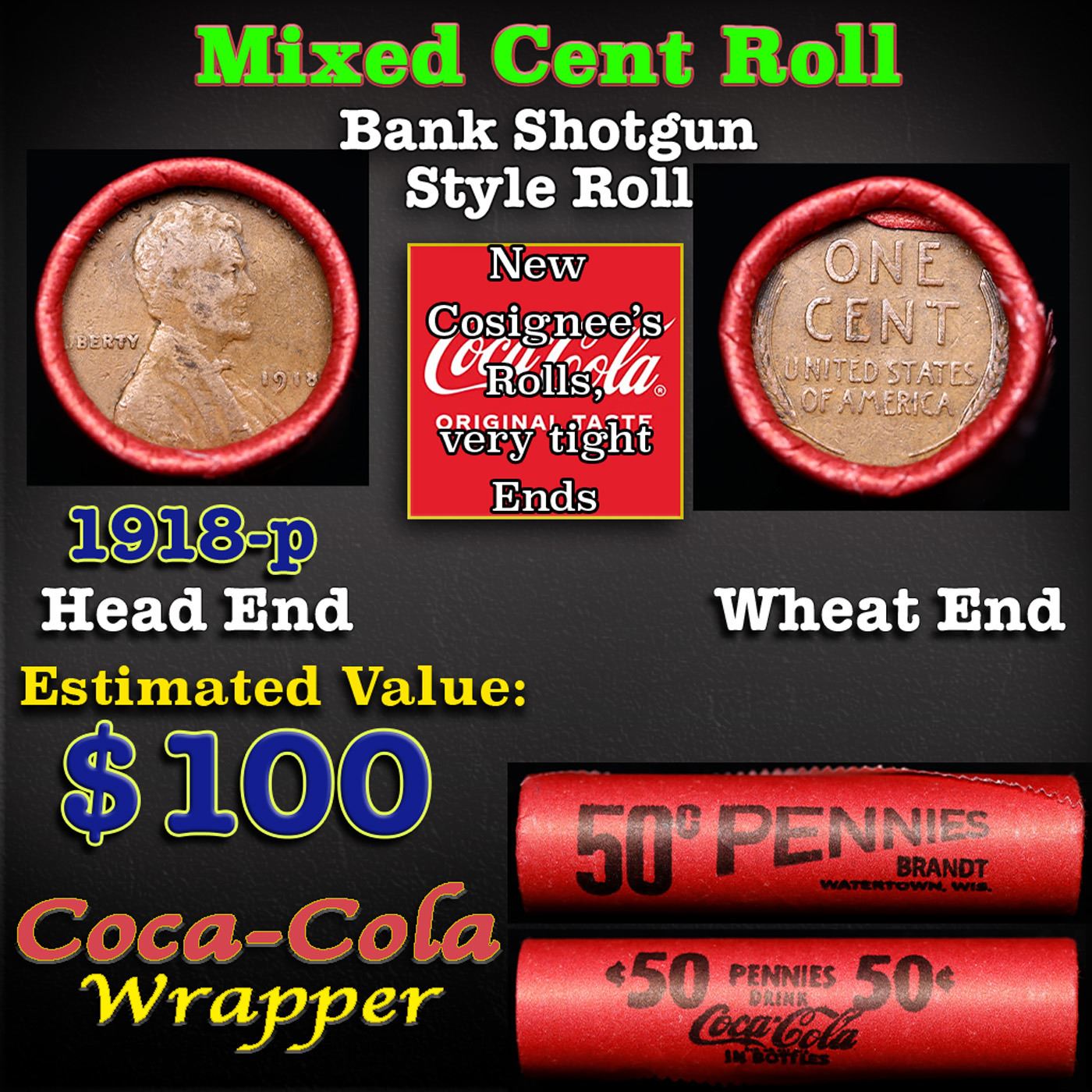 Mixed small cents 1c orig shotgun roll, 1918-p Lincoln Cent, Wheat Cent other end, Coca Cola Wrapper. Actual roll pictured is the roll you will get. A Brandt wrapper stamped Coca-Cola. A great original bank shotgun roll with very tight ends. We have opened a few of these rolls. They seem to be mixed small cents including Indians, Wheats, Steel cents & some Flying Eagles mixed in. These shotgun rolls are all from a new consignee. They are all frrom one Estate.