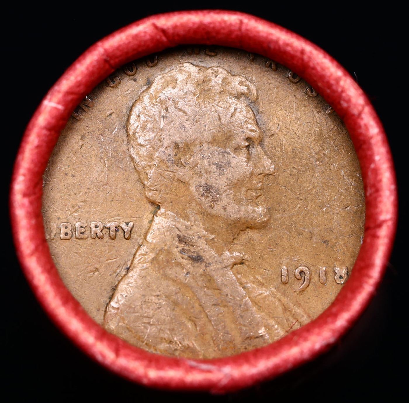 Mixed small cents 1c orig shotgun roll, 1918-p Lincoln Cent, Wheat Cent other end, Coca Cola Wrapper