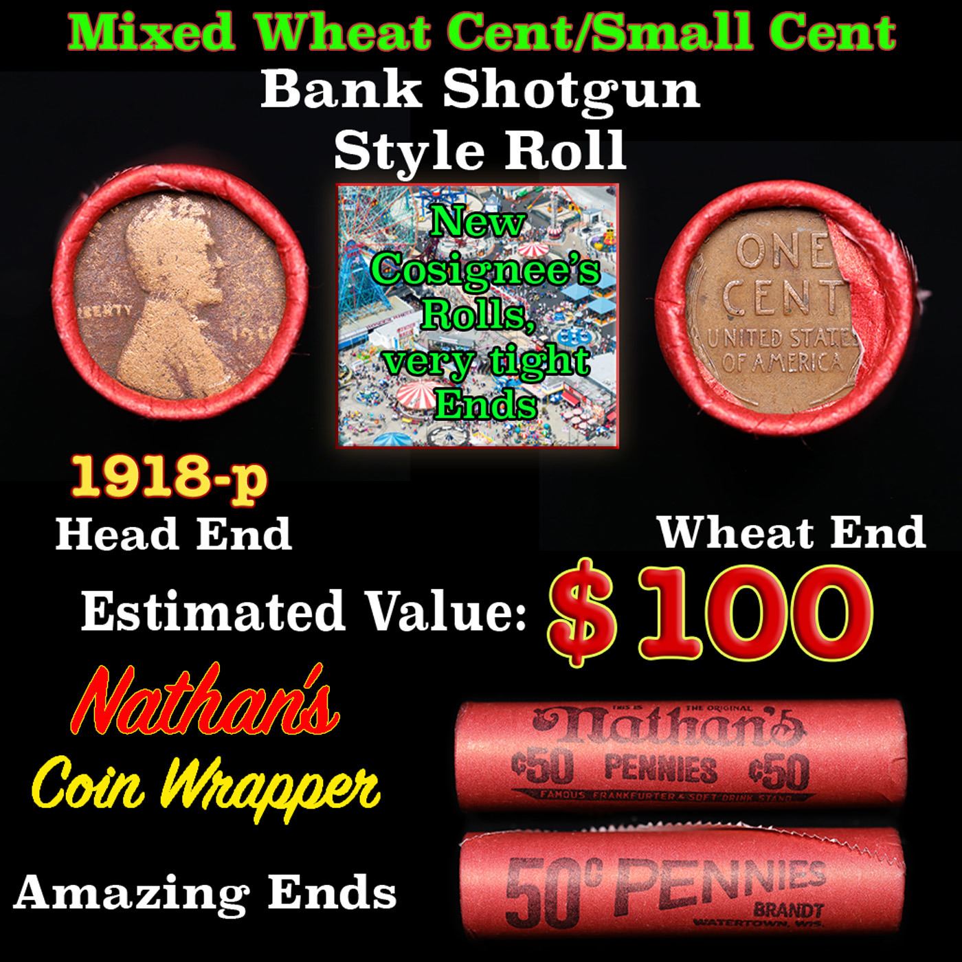 Mixed small cents 1c orig shotgun roll, 1918-p Lincoln Cent, Wheat Cent other end, Nathan's Brandt Wrapper.. The roll is held in an old Rare & Collectable Brinks 'Only Brinks Can Open This Safe, Chicago IL' Penny wrapper. Actual roll pictured is the roll you will get. A great original bank shotgun roll with very tight ends. We have opened a few of these rolls. They seem to be mixed small cents including Indians, Wheats, Steel cents & some Flying Eagles mixed in. These shotgun rolls are all from a new consignee. They are all frrom one Estate.