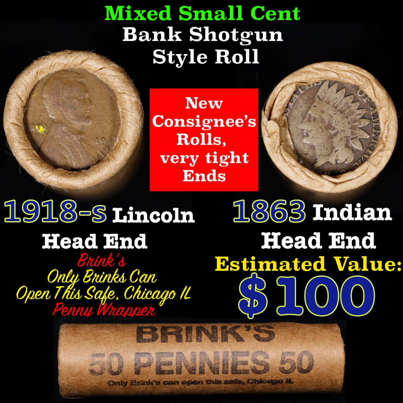 Mixed small cents 1c orig shotgun roll, 1918-s Wheat Cent, 1863 Indian Cent other end, Brinks Wrapper.. The roll is held in an old Rare & Collectable Brinks 'Only Brinks Can Open This Safe, Chicago IL' Penny wrapper. Actual roll pictured is the roll you will get. A great original bank shotgun roll with very tight ends. We have opened a few of these rolls. They seem to be mixed small cents including Indians, Wheats, Steel cents & some Flying Eagles mixed in. These shotgun rolls are all from a new consignee. They are all frrom one Estate.
