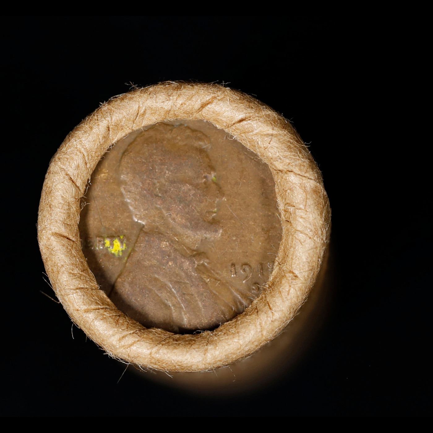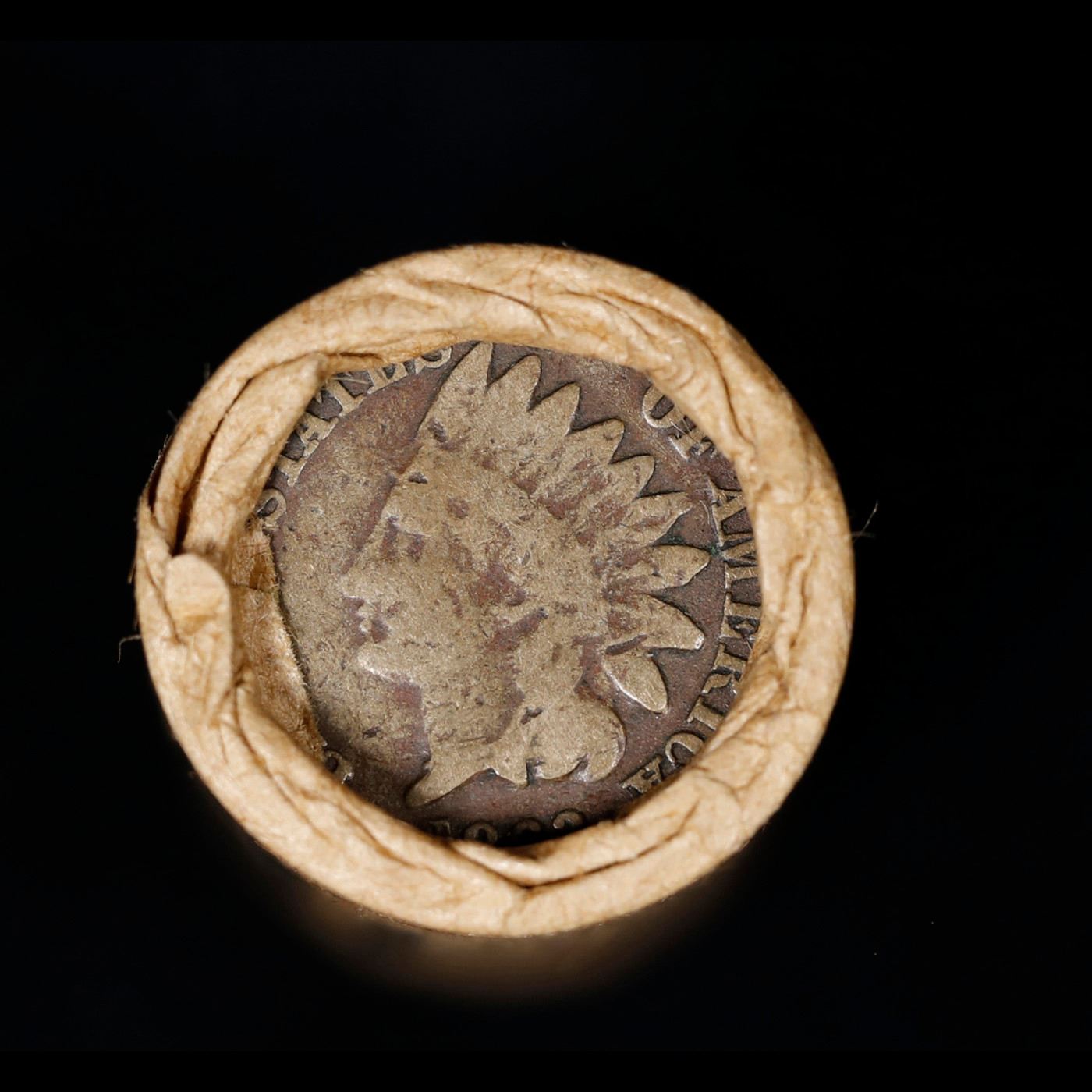 Mixed small cents 1c orig shotgun roll, 1918-s Wheat Cent, 1863 Indian Cent other end, Brinks Wrappe