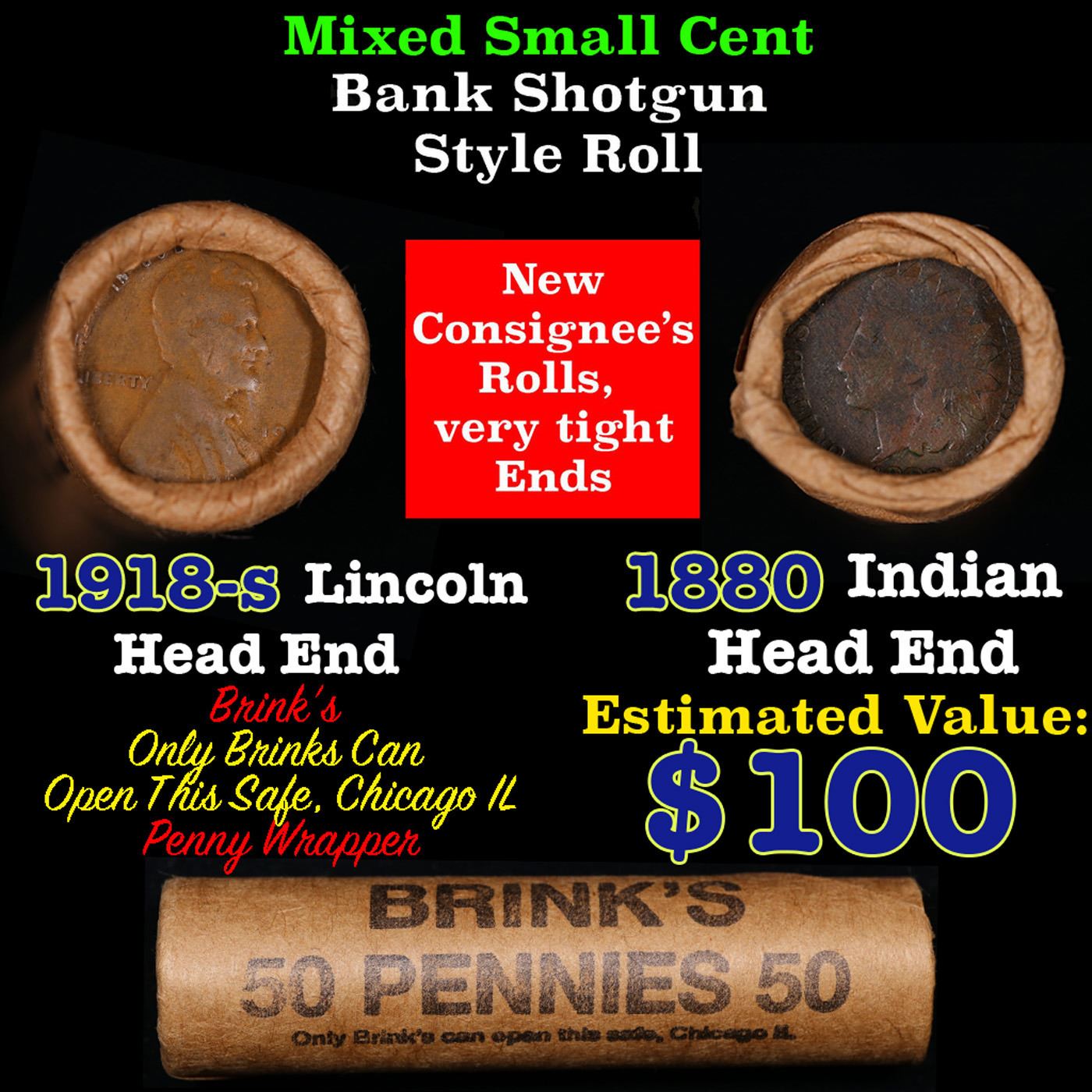 Mixed small cents 1c orig shotgun roll, 1918-s Wheat Cent, 1880 Indian Cent other end, Brinks Wrapper. The roll is held in an old Rare & Collectable Brinks Wrapper. Actual roll pictured is the roll you will get. A great original bank shotgun roll with very tight ends. We have opened a few of these rolls. They seem to be mixed small cents including Indians, Wheats, Steel cents & some Flying Eagles mixed in. These shotgun rolls are all from a new consignee. They are all frrom one Estate.