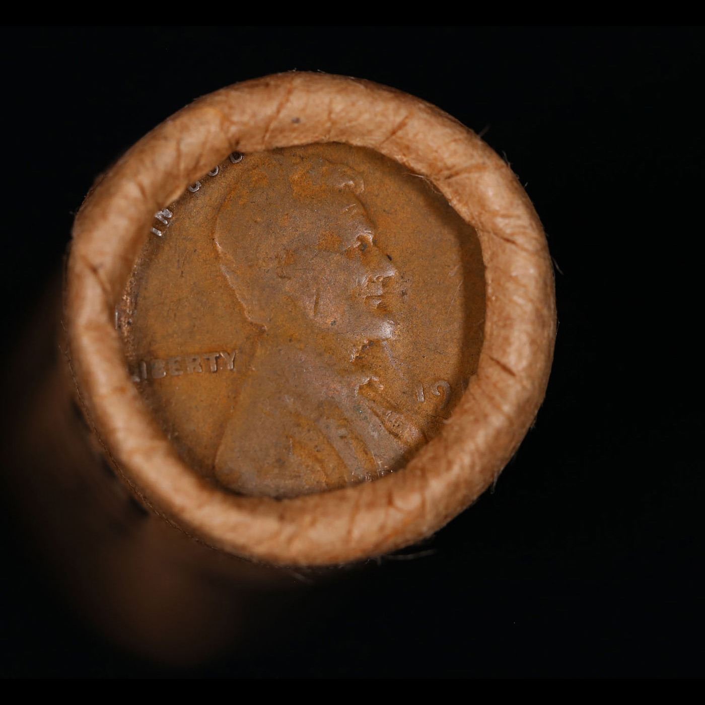 Mixed small cents 1c orig shotgun roll, 1918-s Wheat Cent, 1880 Indian Cent other end, Brinks Wrappe