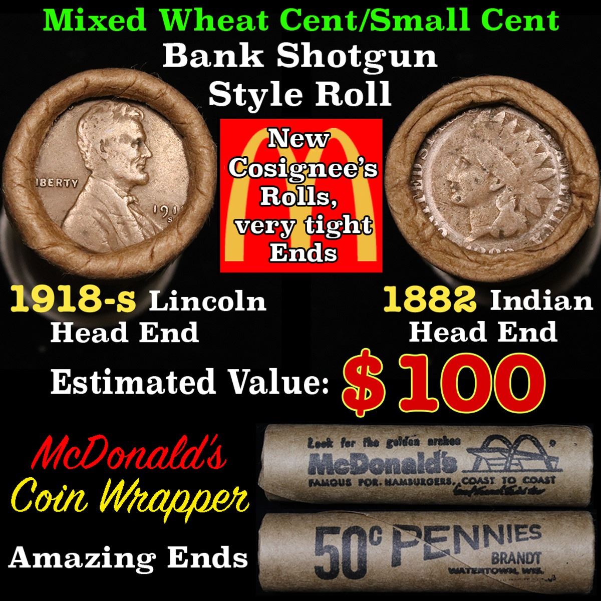 Mixed small cents 1c orig shotgun roll, 1918-s Wheat Cent, 1882 Indian Cent other end. The roll is held in an old Rare & Collectable McDonalds Brandt wrapper. Actual roll pictured is the roll you will get. A great original bank shotgun roll with very tight ends. We have opened a few of these rolls. They seem to be mixed small cents including Indians, Wheats, Steel cents & some Flying Eagles mixed in. These shotgun rolls are all from a new consignee. They are all frrom one Estate.