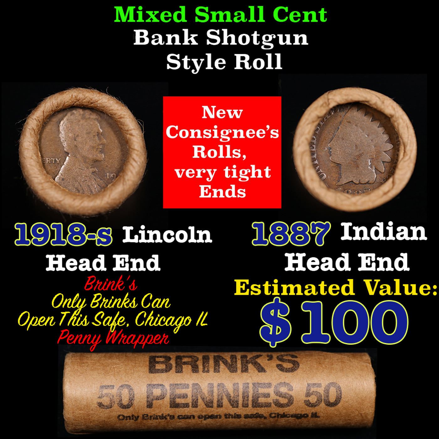 Mixed small cents 1c orig shotgun roll, 1918-s Wheat Cent, 1887 Indian Cent other end, Brinks Wrapper.. The roll is held in an old Rare & Collectable Brinks 'Only Brinks Can Open This Safe, Chicago IL' Penny wrapper. Actual roll pictured is the roll you will get. A great original bank shotgun roll with very tight ends. We have opened a few of these rolls. They seem to be mixed small cents including Indians, Wheats, Steel cents & some Flying Eagles mixed in. These shotgun rolls are all from a new consignee. They are all frrom one Estate.