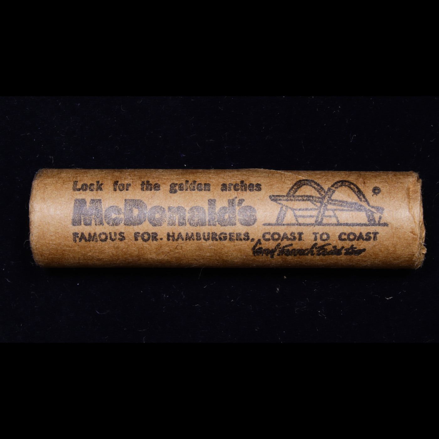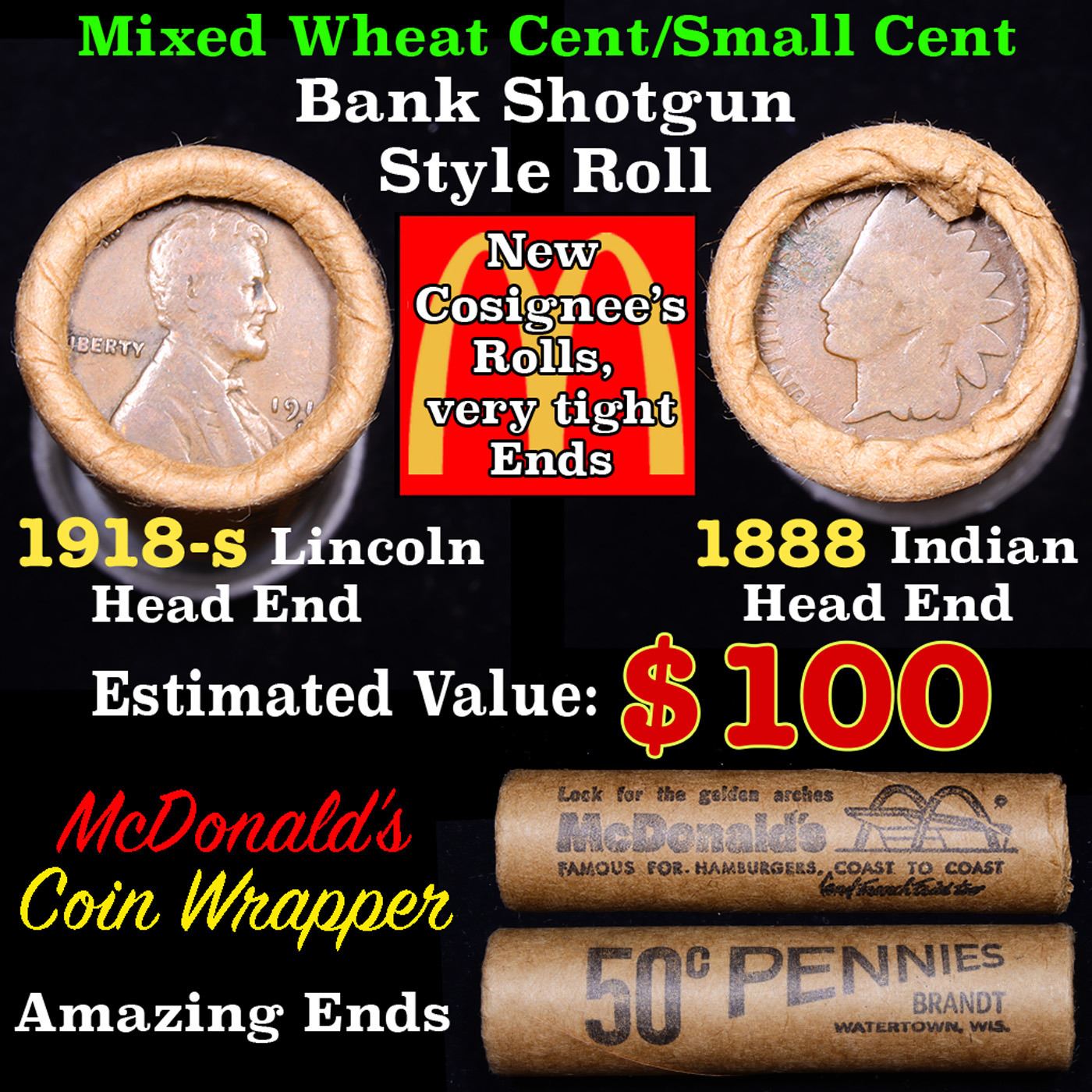 Mixed small cents 1c orig shotgun roll, 1918-s Wheat Cent, 1888 Indian cent other end, McDonalds Wrapper. The roll is held in an old Rare & Collectable McDonalds Wrapper. Look for the Golden Arches. Actual roll pictured is the roll you will get. A great original bank shotgun roll with very tight ends. We have opened a few of these rolls. They seem to be mixed small cents including Indians, Wheats, Steel cents & some Flying Eagles mixed in. These shotgun rolls are all from a new consignee. They are all frrom one Estate.
