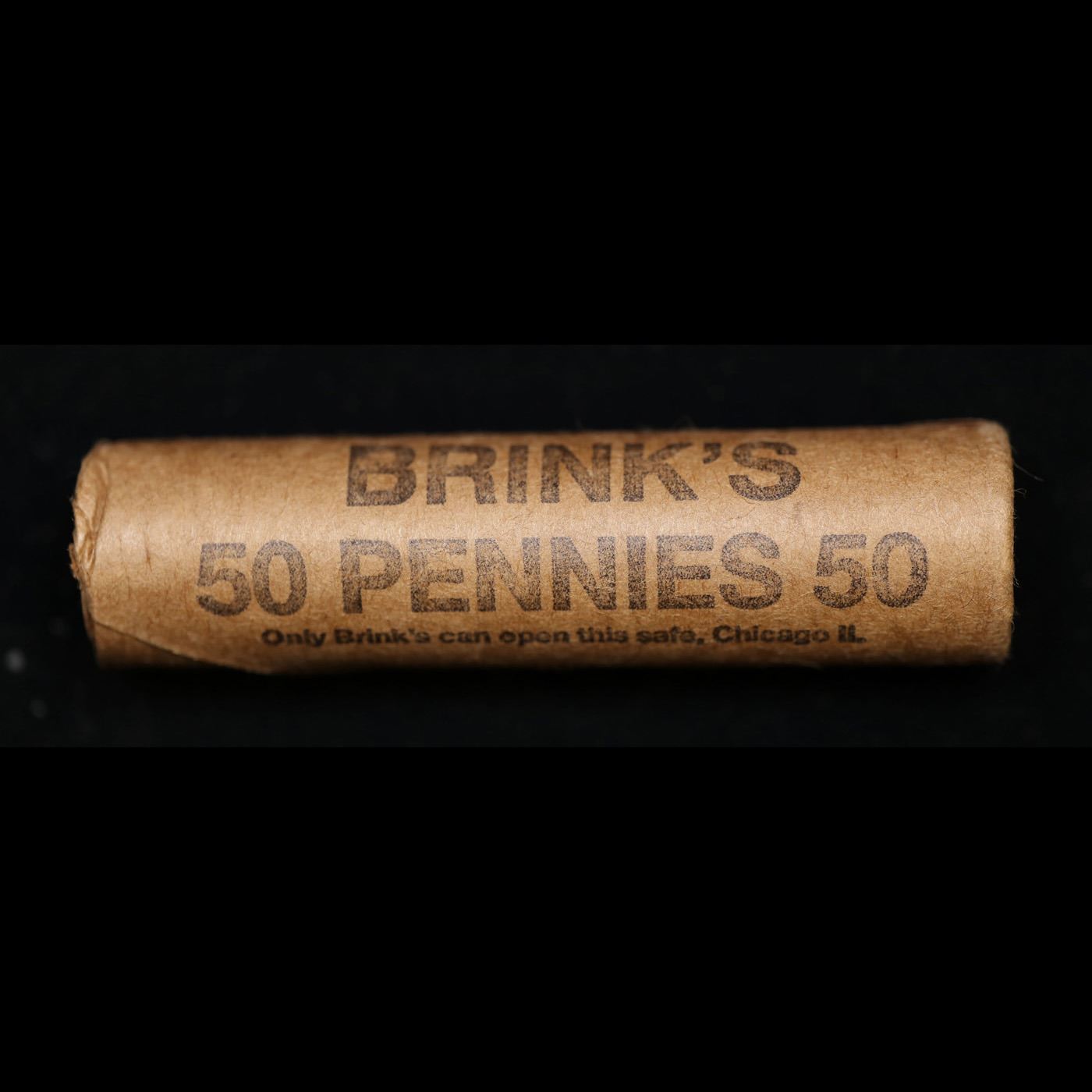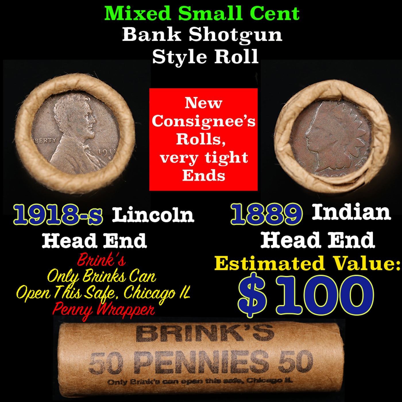 Mixed small cents 1c orig shotgun roll, 1918-s Wheat Cent, 1889 Indian Cent other end, Brinks Wrapper.. The roll is held in an old Rare & Collectable Brinks 'Only Brinks Can Open This Safe, Chicago IL' Penny wrapper. Actual roll pictured is the roll you will get. A great original bank shotgun roll with very tight ends. We have opened a few of these rolls. They seem to be mixed small cents including Indians, Wheats, Steel cents & some Flying Eagles mixed in. These shotgun rolls are all from a new consignee. They are all frrom one Estate.