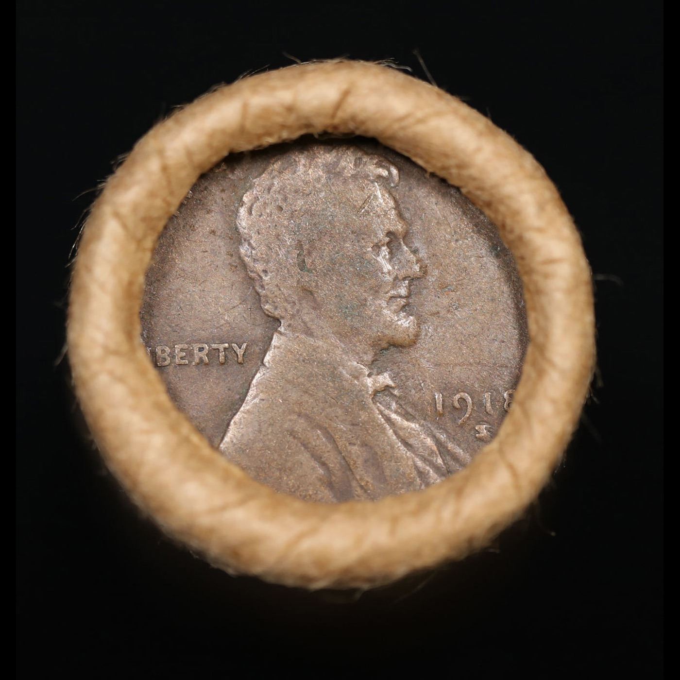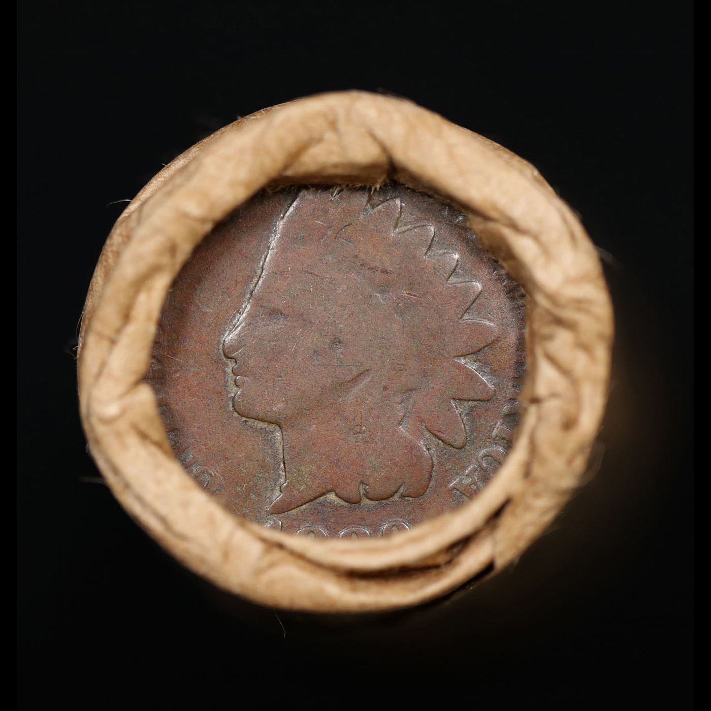 Mixed small cents 1c orig shotgun roll, 1918-s Wheat Cent, 1889 Indian Cent other end, Brinks Wrappe