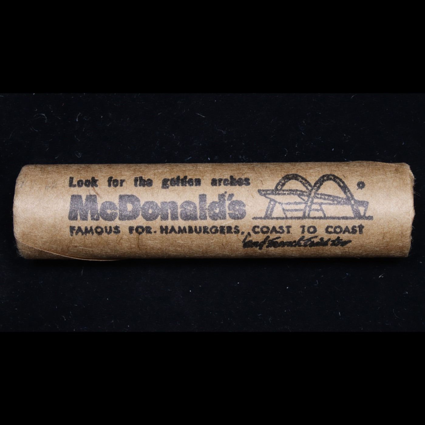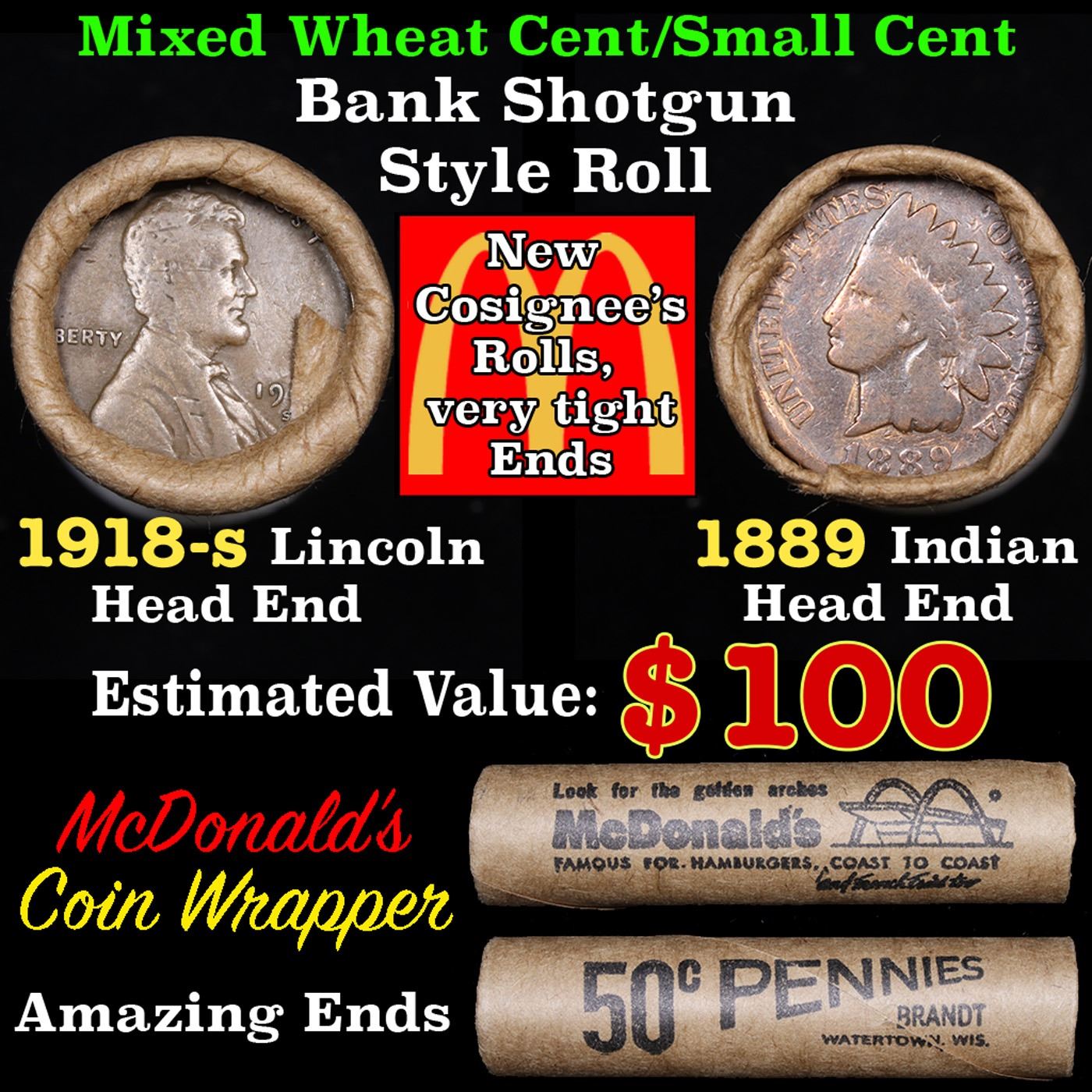 Mixed small cents 1c orig shotgun roll, 1918-s Wheat Cent, 1889 Indian Cent other end, McDonalds Wrapper Grades. The roll is held in an old Rare & Collectable McDonalds Brandt wrapper. Look For The Golden Arches. Actual roll pictured is the roll you will get. A great original bank shotgun roll with very tight ends. We have opened a few of these rolls. They seem to be mixed small cents including Indians, Wheats, Steel cents & some Flying Eagles mixed in. These shotgun rolls are all from a new consignee. They are all frrom one Estate.