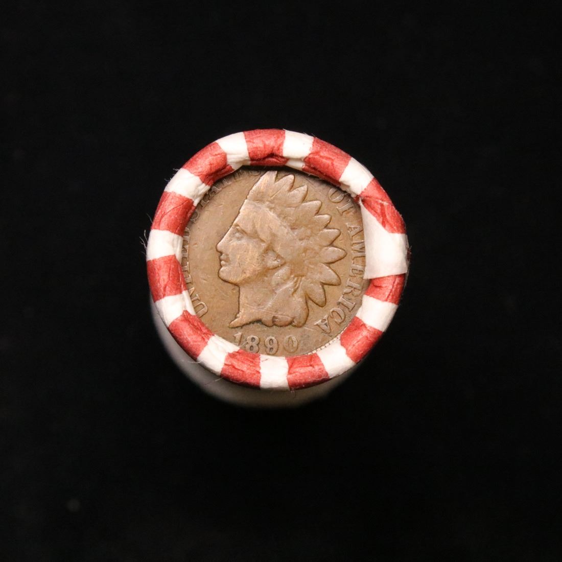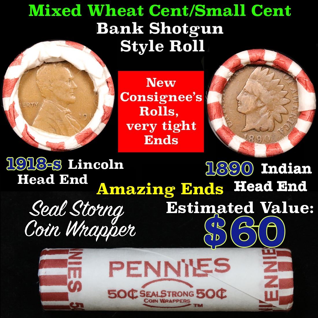 Mixed small cents 1c orig shotgun roll,1918-s Wheat Cent, 1890 Indian Cent other end. The roll is held in an old Seal Strong wrapper. Actual roll pictured is the roll you will get. A great original bank shotgun roll with very tight ends. We have been getting excellent feedback on these rolls. Were being told that close to half the roll are teens, some with mintmarks, there are a few Indians in all the rolls, most of the rolls have steel cents. They seem to be PQ Wheaties rolls. These shotgun rolls are all from a new consignee. They are all frrom one Estate.