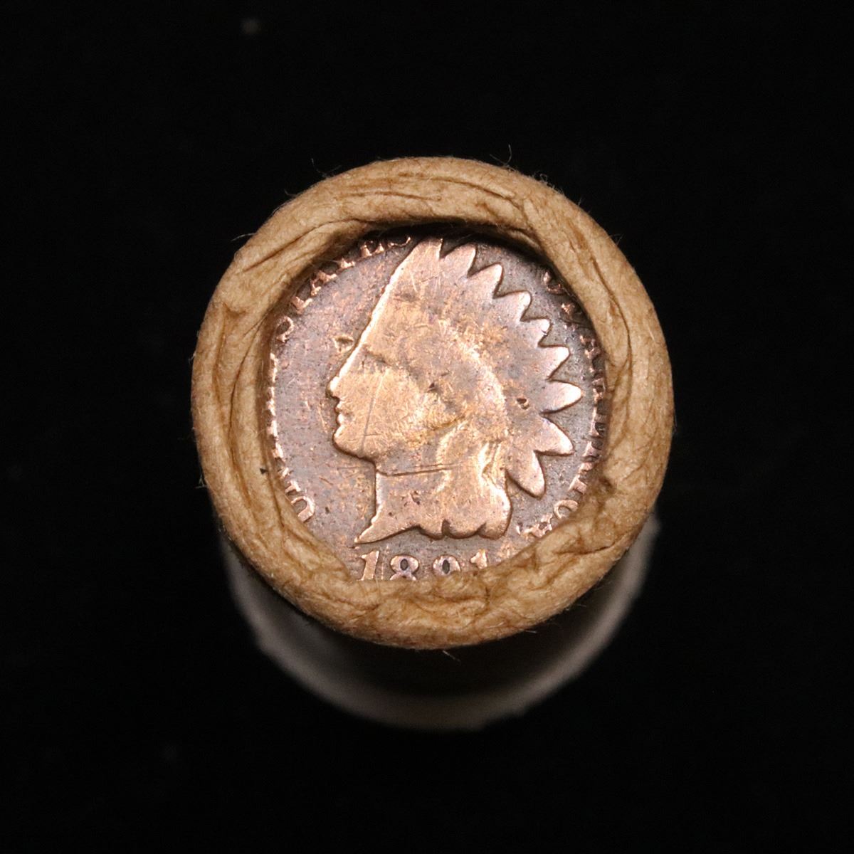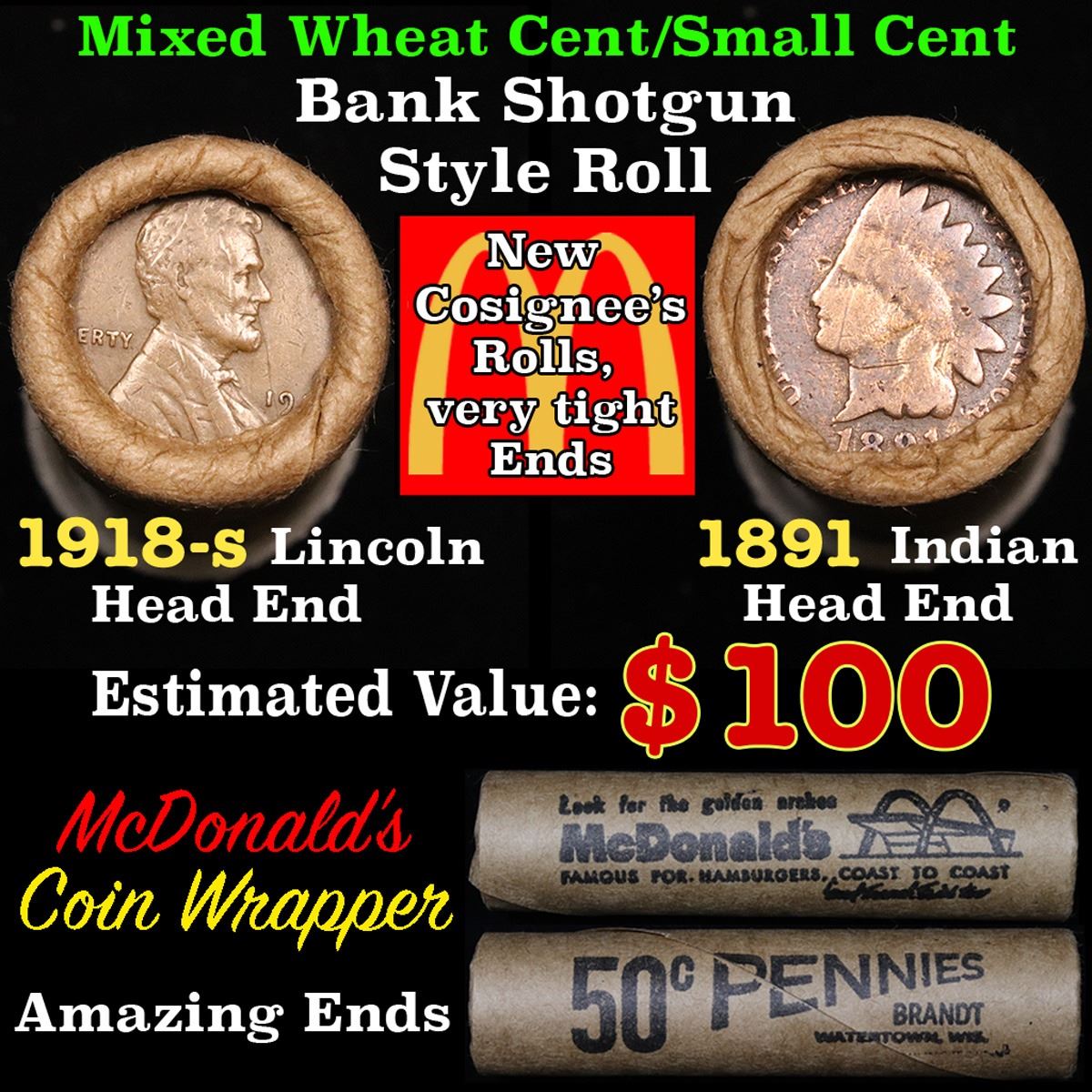 Mixed small cents 1c orig shotgun roll, 1918-s Wheat Cent, 1891 Indian Cent other end. The roll is held in an old Rare & Collectable McDonalds Brandt wrapper. Actual roll pictured is the roll you will get. A great original bank shotgun roll with very tight ends. We have opened a few of these rolls. They seem to be mixed small cents including Indians, Wheats, Steel cents & some Flying Eagles mixed in. These shotgun rolls are all from a new consignee. They are all frrom one Estate.