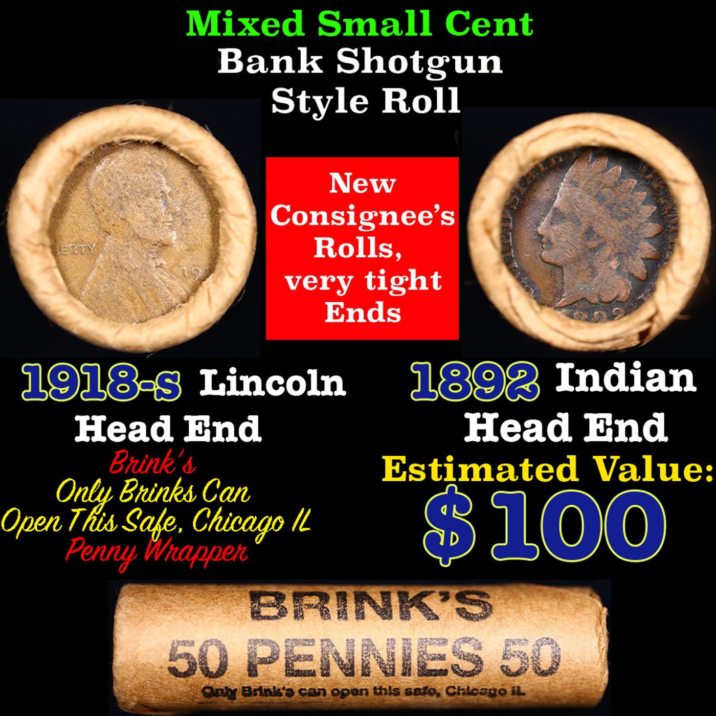 Mixed small cents 1c orig shotgun roll, 1918-s Wheat Cent, 1892 Indian Cent other end, brinks Wrapper. The roll is held in an old Rare & Collectable Brinks 'Only Brinks Can Open This Safe, Chicago IL' Penny wrapper. Actual roll pictured is the roll you will get. A great original bank shotgun roll with very tight ends. We have opened a few of these rolls. They seem to be mixed small cents including Indians, Wheats, Steel cents & some Flying Eagles mixed in. These shotgun rolls are all from a new consignee. They are all frrom one Estate.