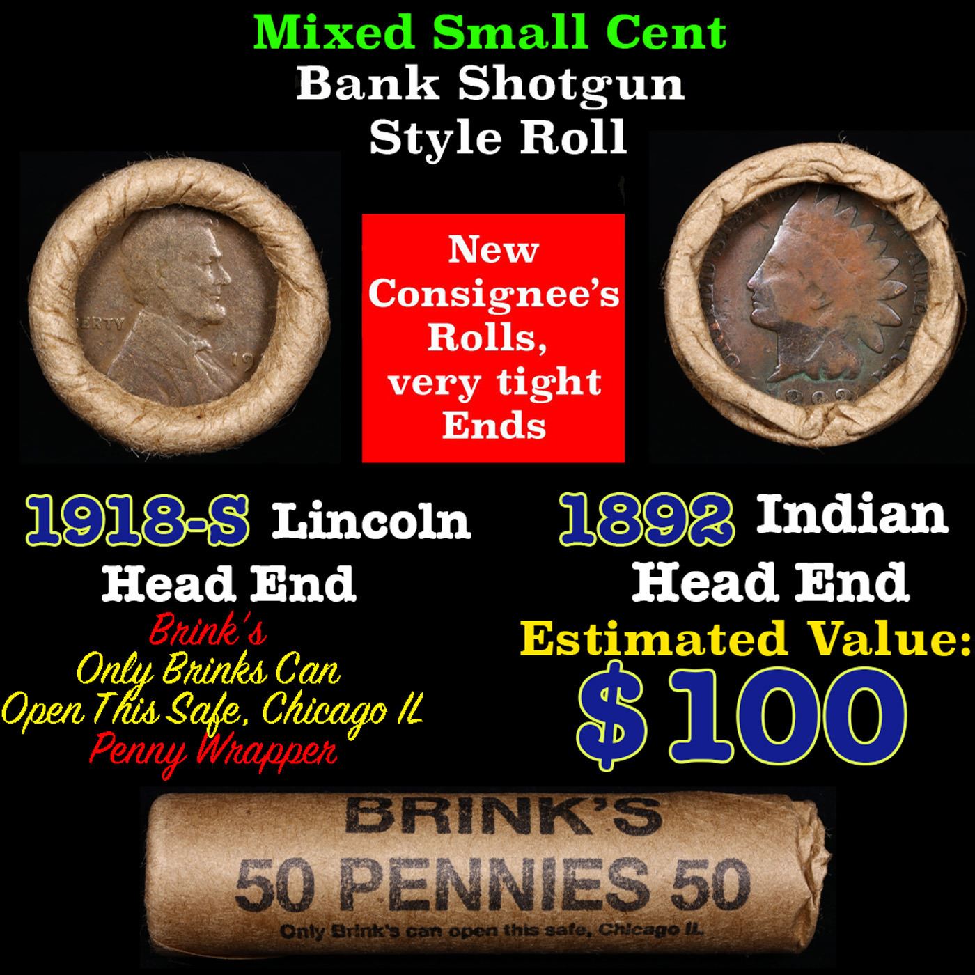 Mixed small cents 1c orig shotgun roll, 1918-s Wheat Cent, 1892 Indian Cent other end, brinks Wrapper. The roll is held in an old Rare & Collectable Brinks 'Only Brinks Can Open This Safe, Chicago IL' Penny wrapper. Actual roll pictured is the roll you will get. A great original bank shotgun roll with very tight ends. We have opened a few of these rolls. They seem to be mixed small cents including Indians, Wheats, Steel cents & some Flying Eagles mixed in. These shotgun rolls are all from a new consignee. They are all frrom one Estate.