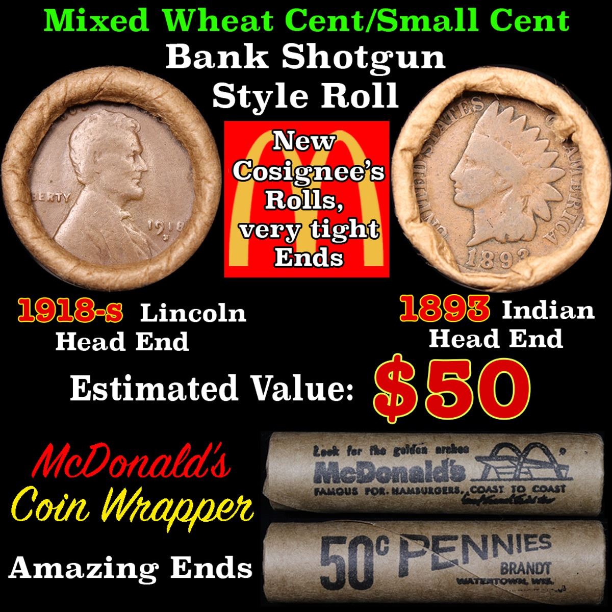 Mixed small cents 1c orig shotgun roll, 1918-s Wheat Cent, 1893 Indian Cent other end. The roll is held in an old Rare & Collectable McDonalds Brandt wrapper. Actual roll pictured is the roll you will get. A great original bank shotgun roll with very tight ends. We have opened a few of these rolls. They seem to be mixed small cents including Indians, Wheats, Steel cents & some Flying Eagles mixed in. These shotgun rolls are all from a new consignee. They are all from one Estate.