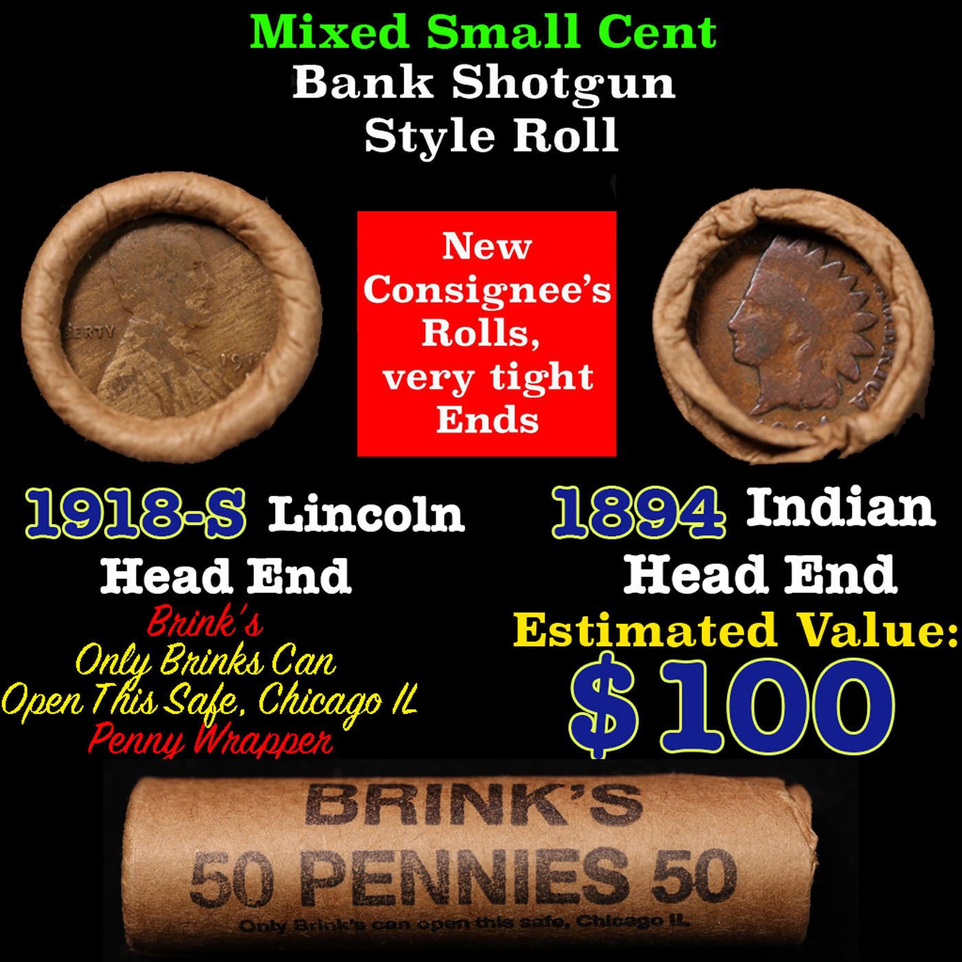Mixed small cents 1c orig shotgun roll, 1918-s Wheat Cent, 1894 Indian Cent other end, Brinks Wrapper. The roll is held in an old Rare & Collectable Brinks Wrapper. Actual roll pictured is the roll you will get. A great original bank shotgun roll with very tight ends. We have opened a few of these rolls. They seem to be mixed small cents including Indians, Wheats, Steel cents & some Flying Eagles mixed in. These shotgun rolls are all from a new consignee. They are all frrom one Estate.
