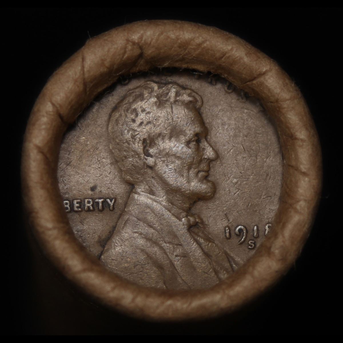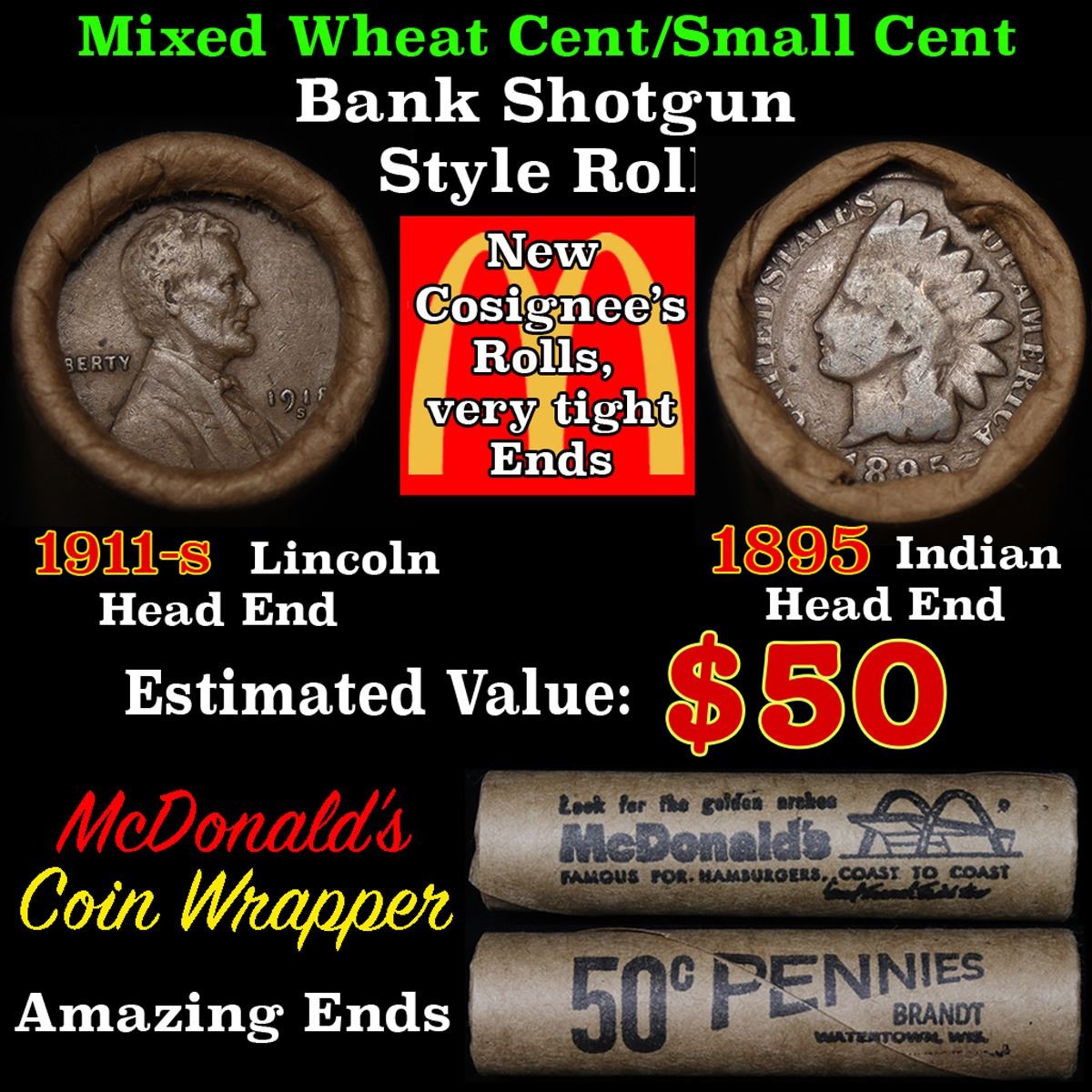 Mixed small cents 1c orig shotgun roll, 1918-s Wheat Cent, 1895 Indian Cent other end