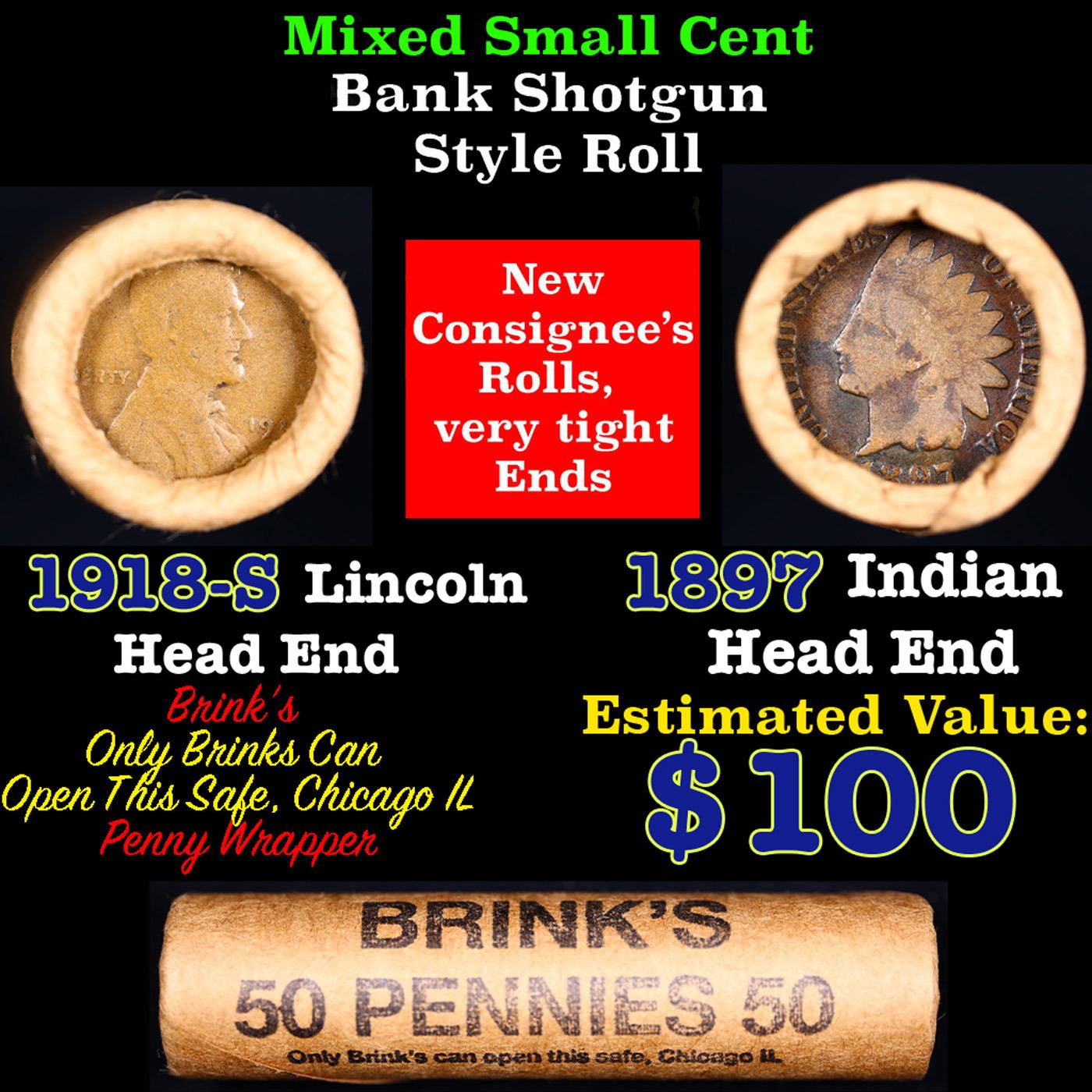Mixed small cents 1c orig shotgun roll, 1918-s Wheat Cent, 1897 Indian Cent other end, brinks Wrapp